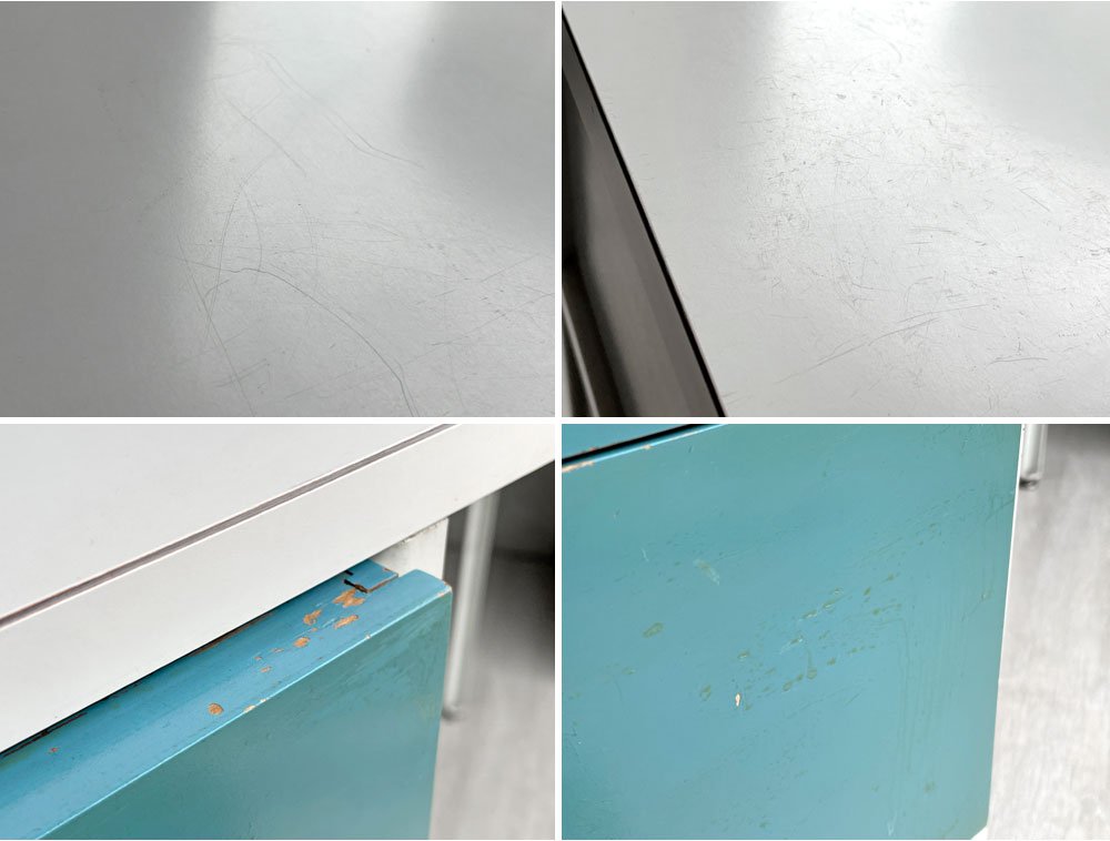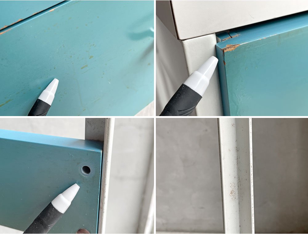 こちらはビンテージのお品物です。使用・経年に伴い、天板表面には線傷や擦れ等の小傷が散見され、フレームには打痕や錆等が見受けられます。各ドロワーには液だれ跡の固着がございます。またネジが1本欠品しておりますが、通常使用する上では問題はございません。経年なりの使用感はございますが、著しいダメージは無く、これからも実用頂けるコンディションを保っております。