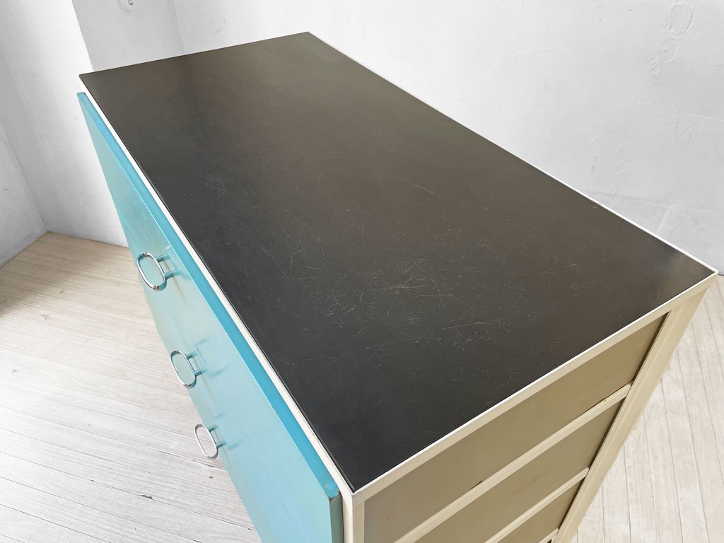 ホワイトのスチールスチールフレームに、シックなブラックの天板と、爽やかなターコイズのドロワーを組み合わせたマルチカラーの一台。