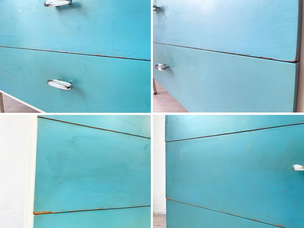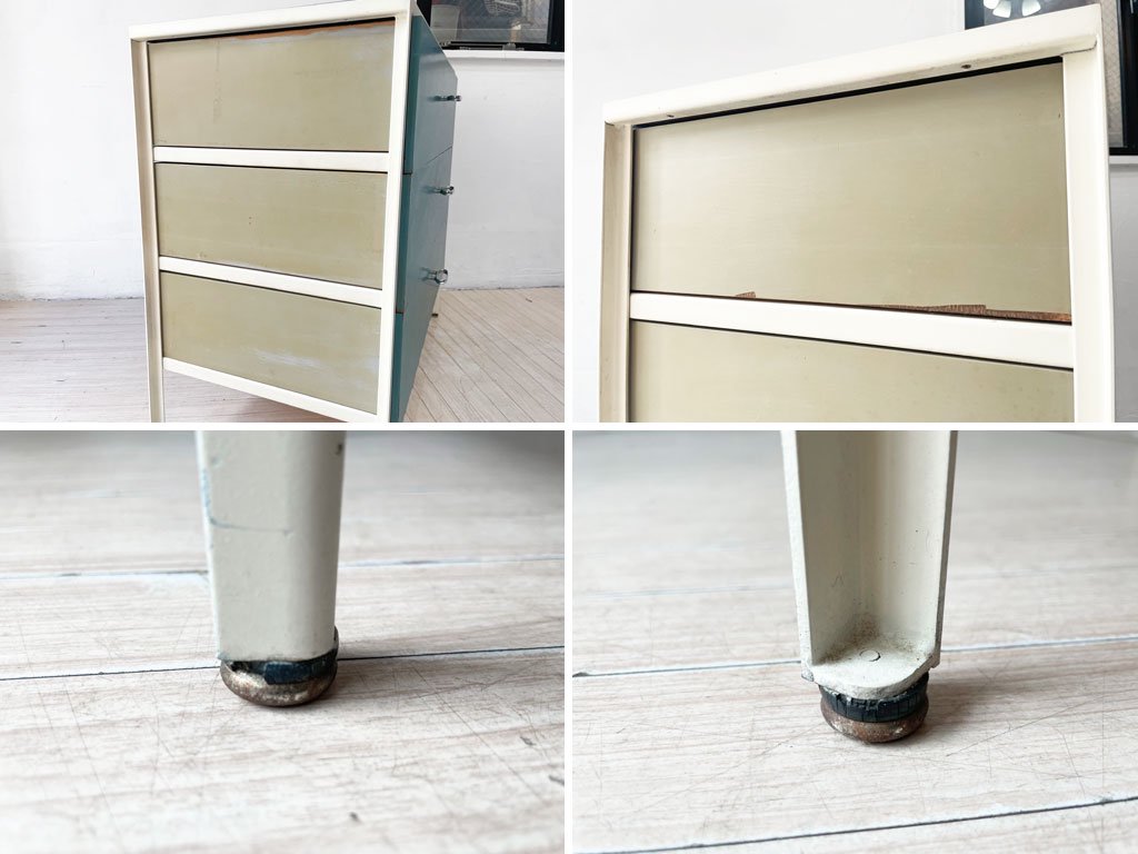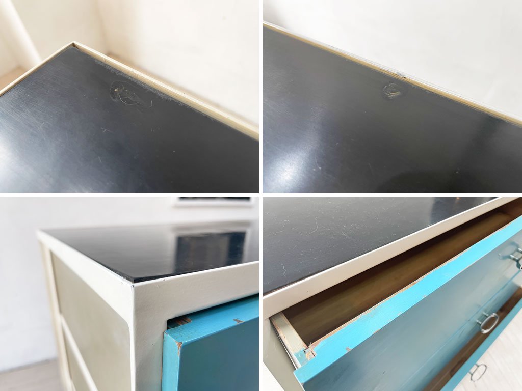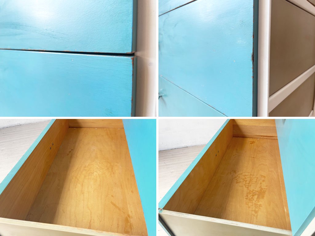コチラのお品物はビンテージ品となります。使用・経年に伴う傷や擦れ、突板の剥がれや引き出し内の汚れ、取り切れない汚れやペイントロスなどが全体的に見受けられます。また、天板角の僅かな浮き、脚部樹脂パーツのヒビや欠けなどがございますが、ガタつきやグラつきなどもございません。。ビンテージ品となり経年なりの使用感はございますが、ご使用に問題のある箇所などもございません。ビンテージ品ならではの風合いをお楽しみ頂けるお品物となっております。