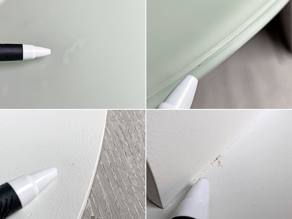 使用に伴い、ガラス天板表面には僅かなくすみ、縁には微細な線傷が見受けられますが、どれも大きく目立つものではございません。ベース部分には色移りや小さな打痕が見受けられます。その他ご使用頂く上で問題となるような大きなダメージは無く、これからも実用頂けるコンディションを保っております。
