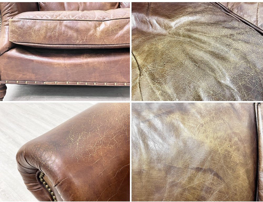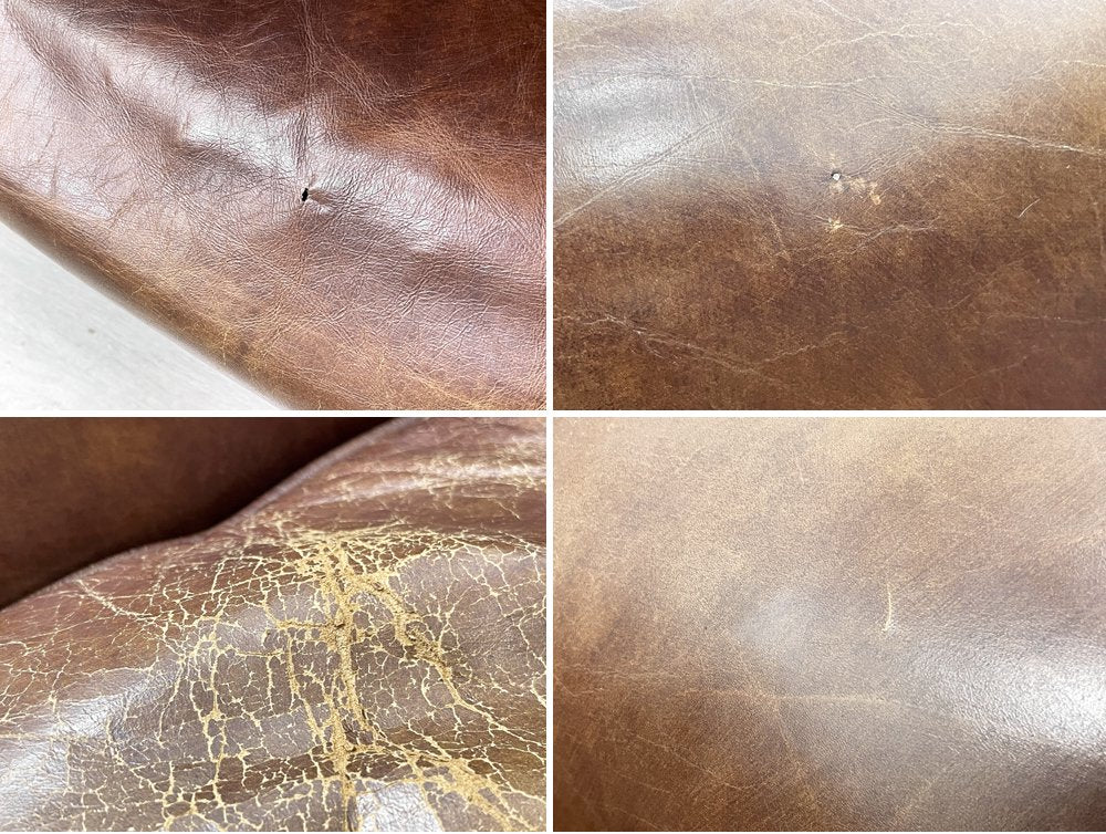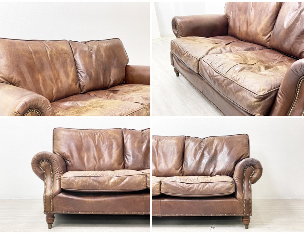 使用に伴う全体的な擦れやレザー表面のひび割れ、色褪せなどががございます。また正面から見て左側の座クッションの下のフレームが凹んでいる事と、その付近にレザー部分の破れが見受けられます。また、右左座面クッションともにクッションのヘタリが感じられ、本来足先に付属しているキャスターが欠品しております。コンディションを考慮しての安価でのご提供となります。予めご了承くださいませ。