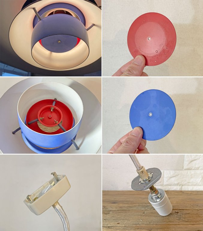 今回はビンテージの1台。シェード最下端のボトムカバーがアルミなのはもちろん、光源とシェードを繋ぐパーツデザイン、はめ込みでは無く立てた爪で接合を行う等現行と異なる初期の仕様を見て取れます。