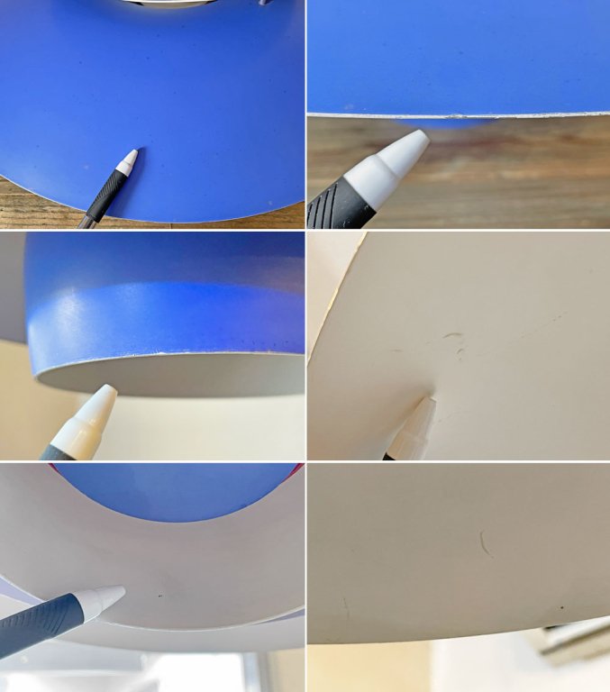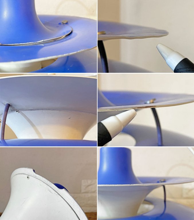 こちらはビンテージ品となります。使用に伴う擦れ傷、スクラッチ、染み、くすみ、色ムラ、黒ずみ、ペイントロス、シェードは上下を繋ぐステー付近や最上段の縁を中心に全体的に歪みが散見され、ほかソケットの脱落を防止する金属のパーツおよびソケット本体は後年になって取り換えられており、オリジナルではございません。