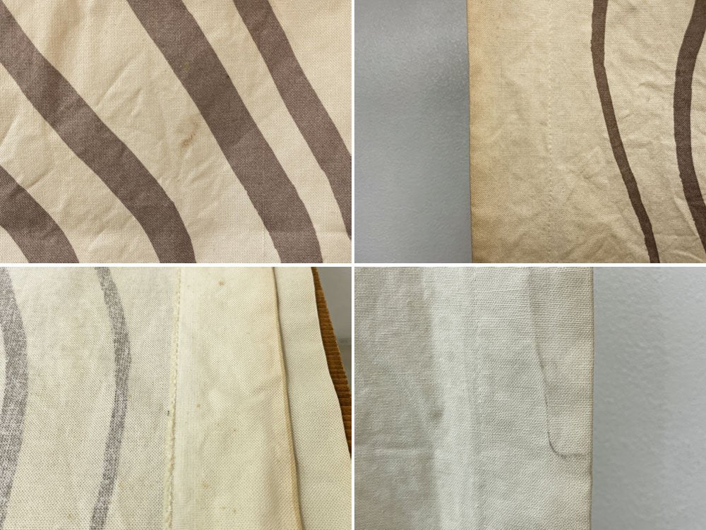 こちらはビンテージのお品物です。全体に日焼けによる黄ばみが生じており、場所に応じてその濃淡が異なります。また、染みも複数箇所ある等ある程度使用感のあるお品物でございますが、ビンテージのインテリアの多いお部屋の場合は、程よく溶け込んでくれそうでもございます。