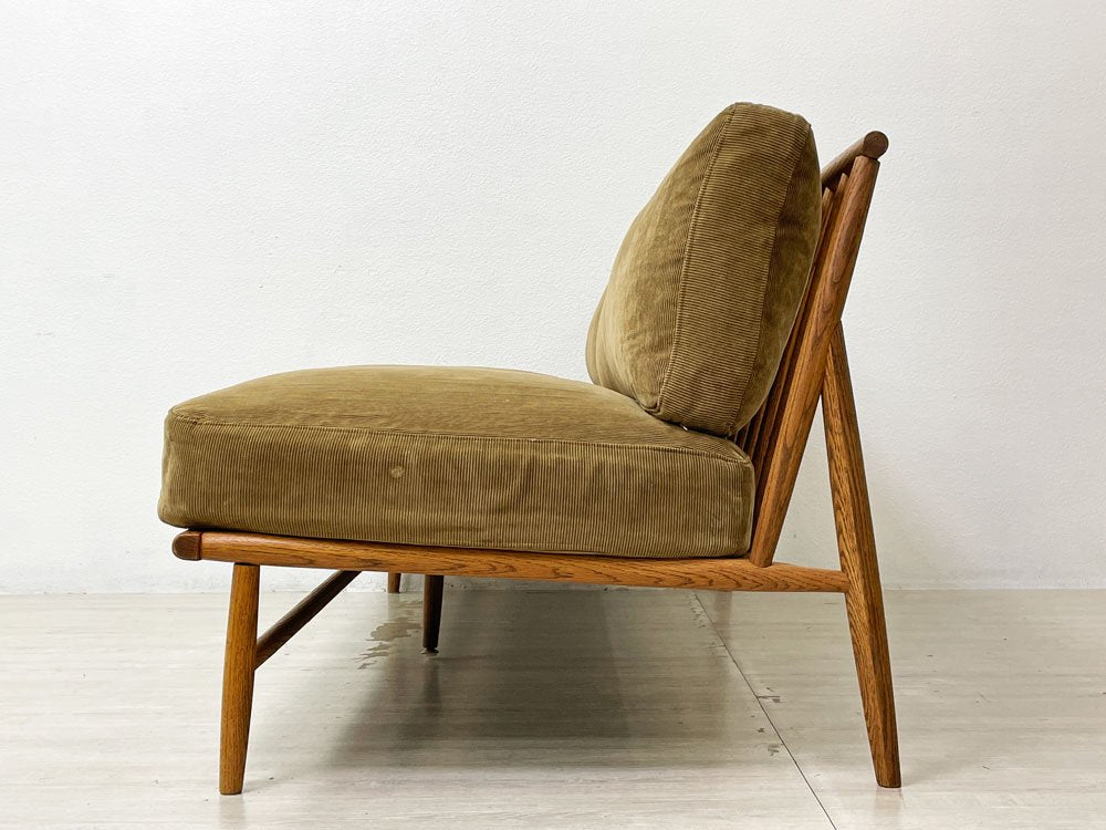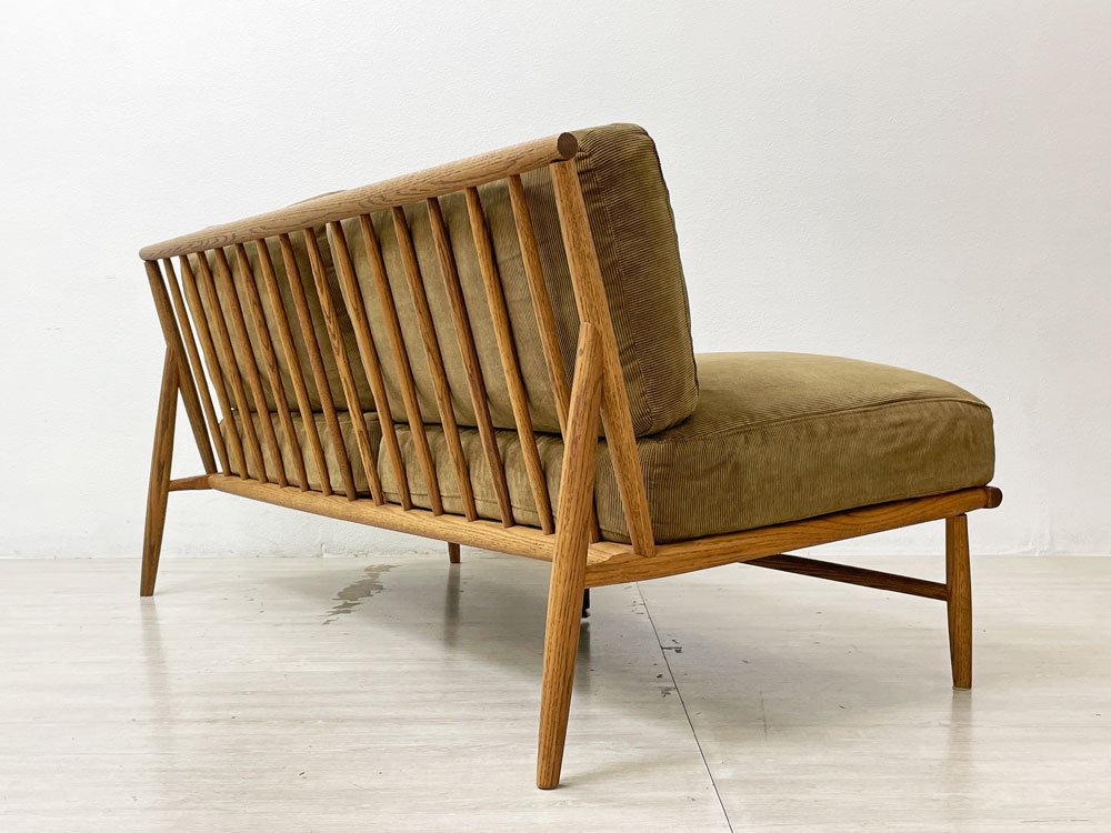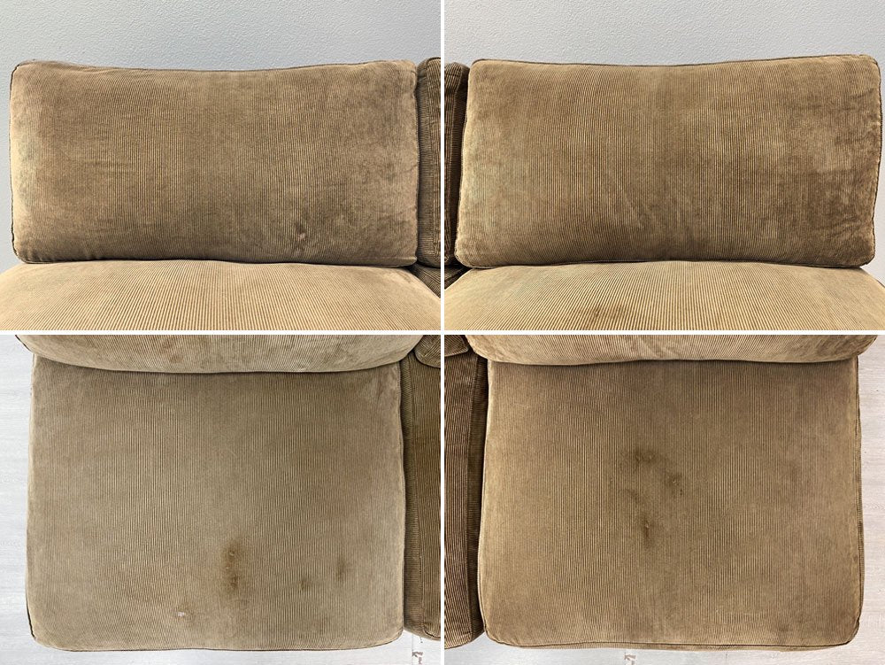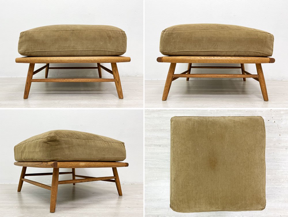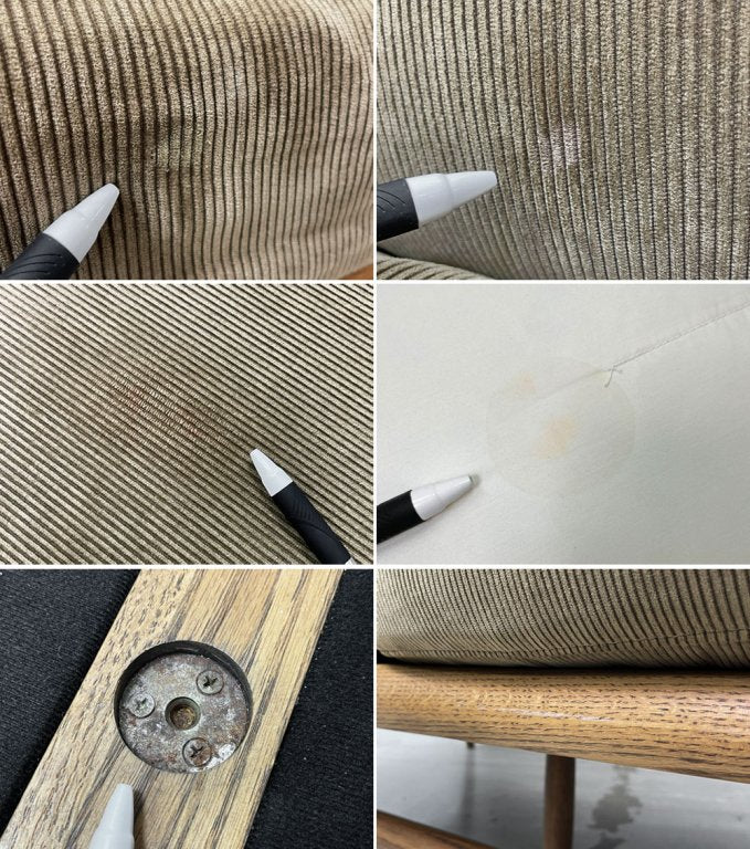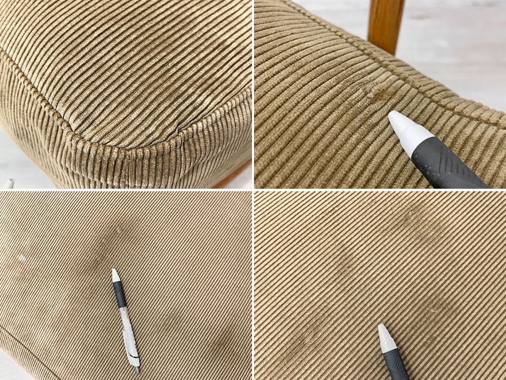 使用に伴う擦れ傷の他、座面クッションには固着跡、オットマンには1か所染みが見られますが、いずれも風合いを損なうものではございません。クッションには僅かに型崩れはございますがヘタリは感じられず、フェザーに複層のウレタン、そしてフレームに貼られたウェビングの組み合わせによる、柔らかくもしっかりと身体を受け止める快適な座り心地を引き続きお楽しみ頂けます。