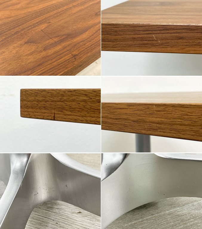重厚感溢れる約3cmの厚みを持たせたウォールナット無垢材天板を採用。自然の温かみを感じられる色合いと美しい杢目に目を奪われます。また自然本来の表情を楽しめる木製天板に対して、ベース部にはアルミダイキャストのXレッグを使用しています。時代に左右されず、ロングユースでお使い頂ける普遍的なデザイン。人気のKチェアのコーディネートにも最適です。
