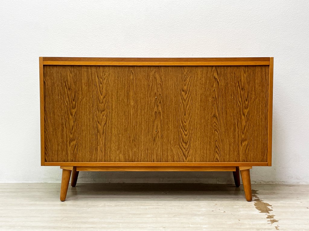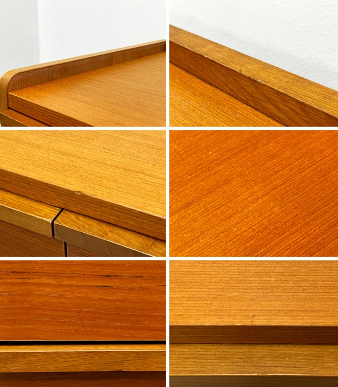 直線を基調としたシンプルな引出しは、チェスト全体のフォルムに合わせた四角いハンドルを使用。対して脚部は丸みを帯び、北欧のビンテージ家具を彷彿とさせる柔らかな印象を加えています。