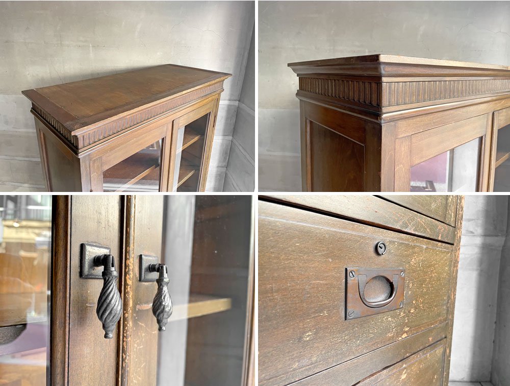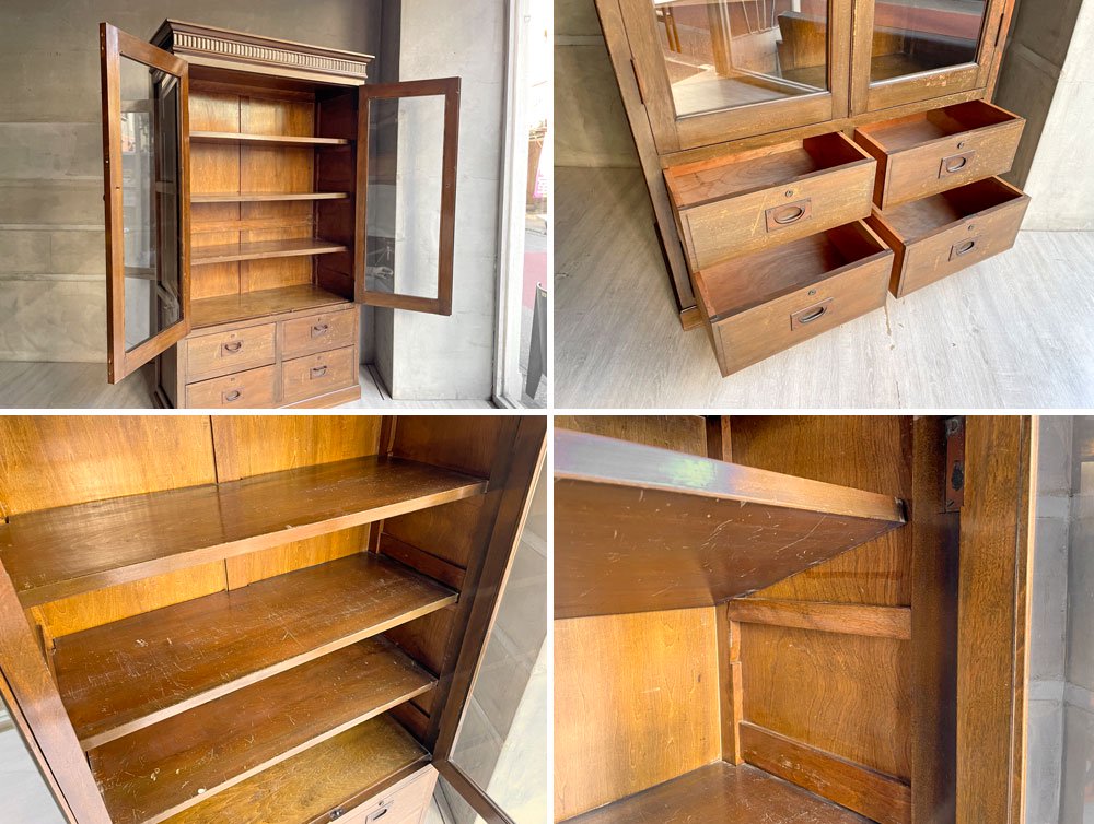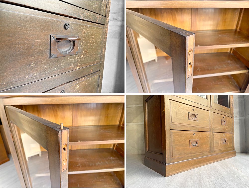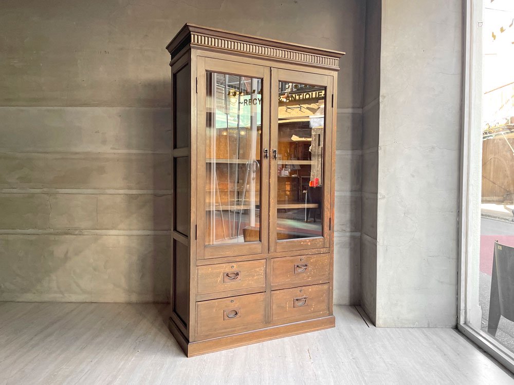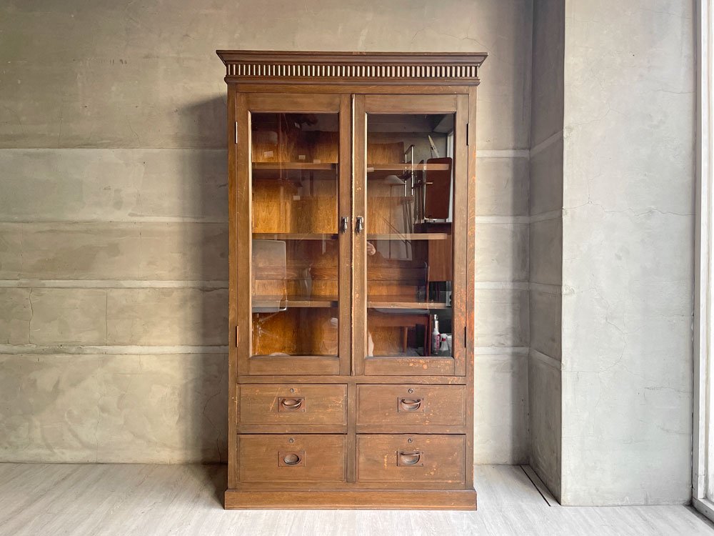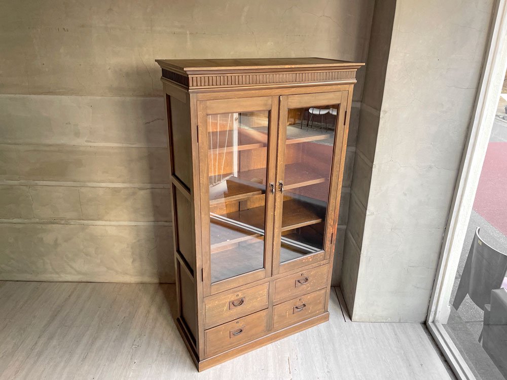 ジャパンビンテージ Japan vintage カップボード ガラス戸 キャビネット 戸棚 食器棚 本棚 抽斗4杯 昭和レトロ 木味 古家具 ♪