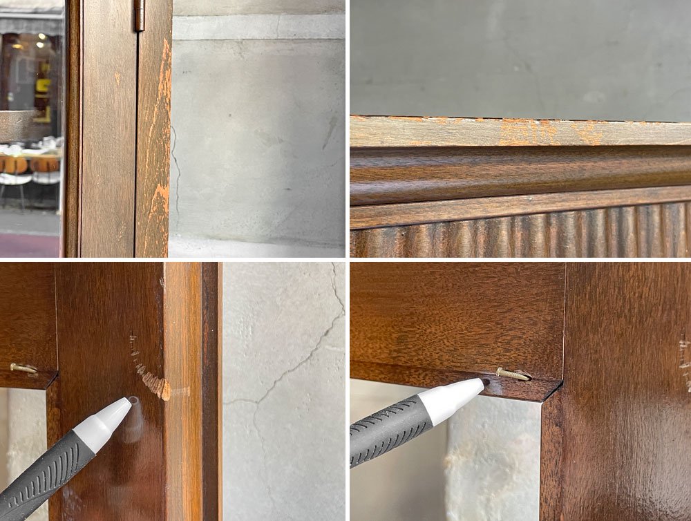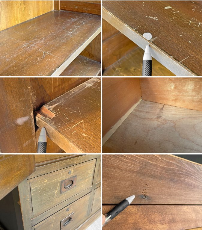 こちらはビンテージのお品物です。経年・使用に伴い、擦れや線傷、打痕や金属部分にサビ、ガリ傷などが散見されます。また釘が突き出ている箇所があり、抽斗内部には小傷や薄い染みが見受けられます。経年なりの使用感・ダメージはございますが、実用に問題は無く、ビンテージの風合いとしてお楽しみ頂けるかと思います。
