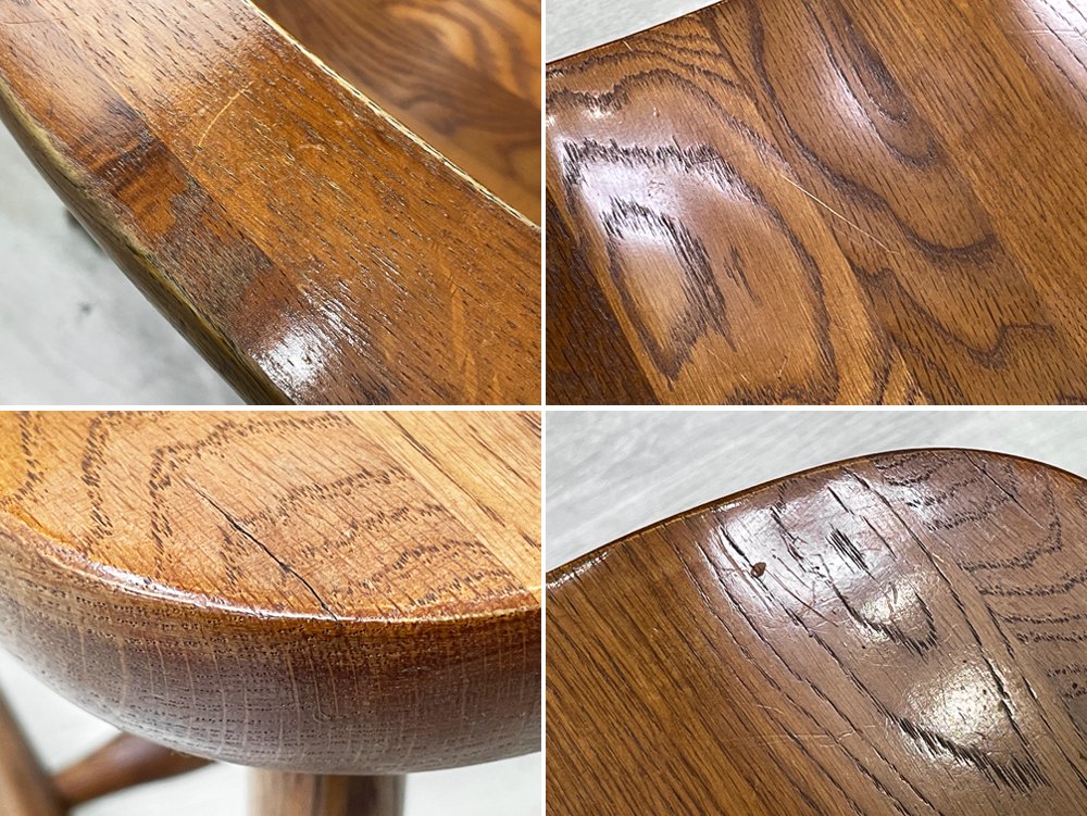 また背もたれのスポークや脚部は、後年に再接着がなされ、それによる補修痕が残っております。一部接合部に小さなヒビや木片の欠けなどが確認出来ますが、ぐらつきやがたつきなどご使用に問題となるような不具合はございません。
