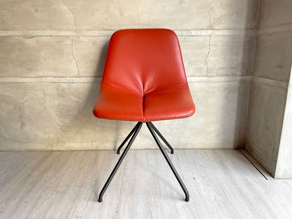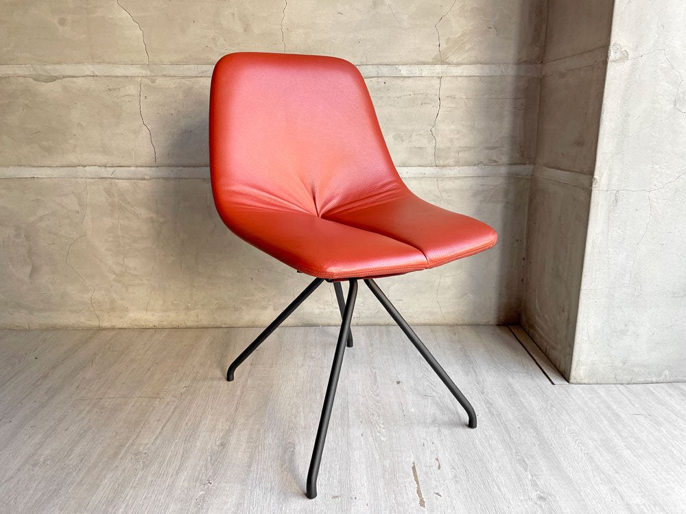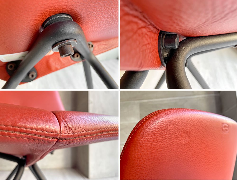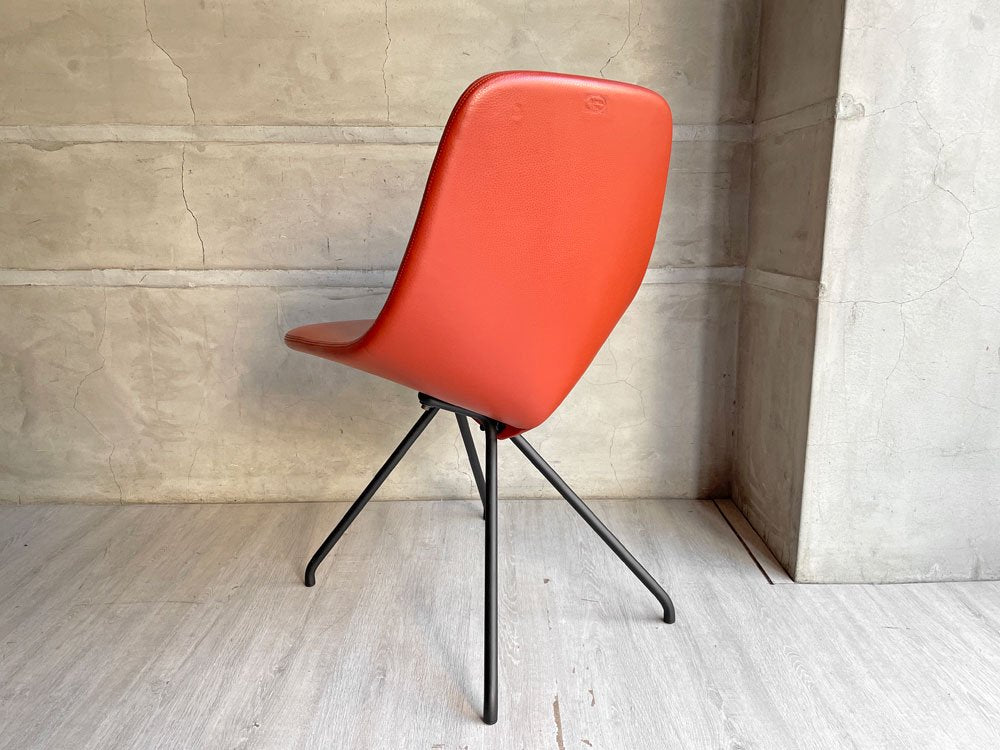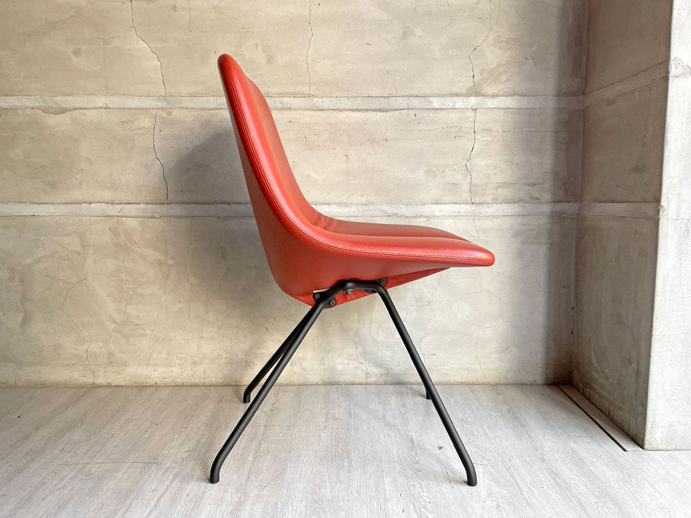 背もたれと座面が一体となったレッドのレザーに、ブラックペイントが施されたスチール脚。