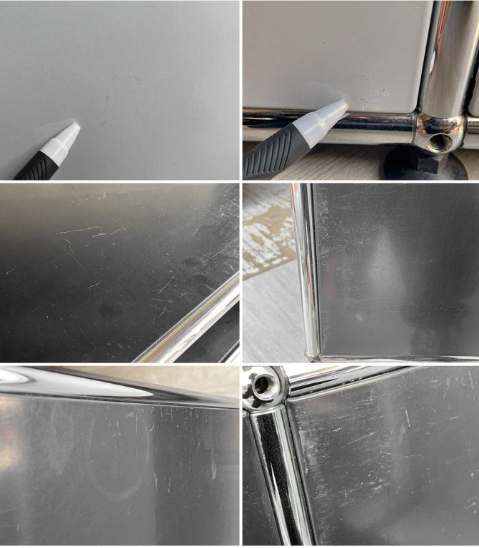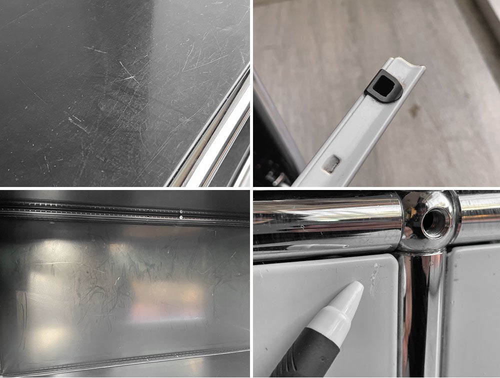 使用に伴い、天板表面には線傷や擦れが散見されます。その他のパネルにも擦れや打痕等の同様のダメージが見受けられます。クロームフレームには落としきれないくすみや微細なサビがある箇所がございます。また、爪の割れが一か所見受けられます。その他ご使用頂く上で問題となるような大きなダメージは無くこれからも実用頂けるコンディションを保っております。