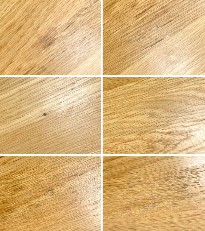 使用に伴う擦れや傷、打痕、天板表面の浮きや染み等のダメージ、ウレタン塗装の剥離による一部色褪せ等がございますが、美観を大きく損ねるような汚れや、機能を損なうような大きなダメージなどは特にございません。