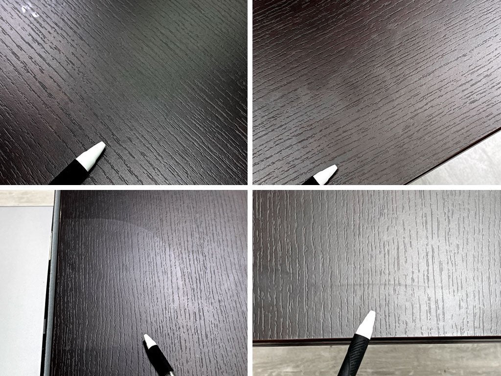 使用に伴い天板に光加減で見える程度の薄い水染みやそれによる色ムラ、脚部に擦れやスクラッチ傷などが見受けられます。また経年に伴い金具にくすみや錆びなどが散見されるものの、昇降や伸長はスムーズに行えます。