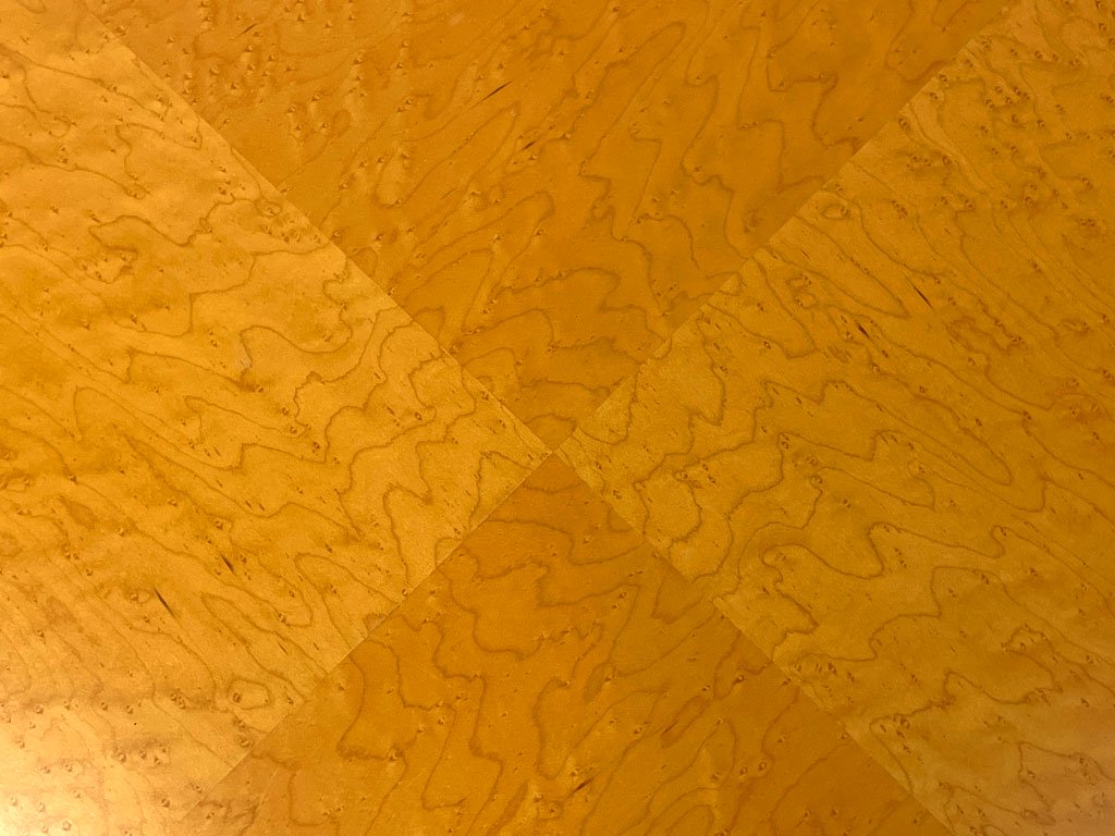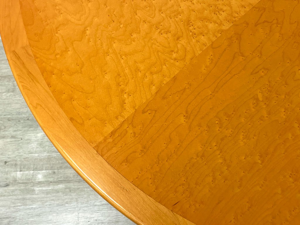 こちらはバーズアイメープルを使用したラウンドダイニングテーブルになります。バーズアイメープルは、「幸せを呼ぶ木」とも称され、エリザベス女王の居室やロールスロイスの内装にも利用されている大変貴重な材。美しい艶感が特徴的です。