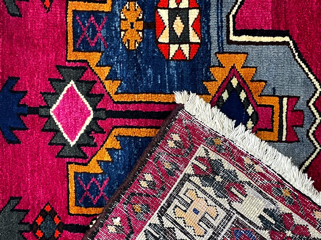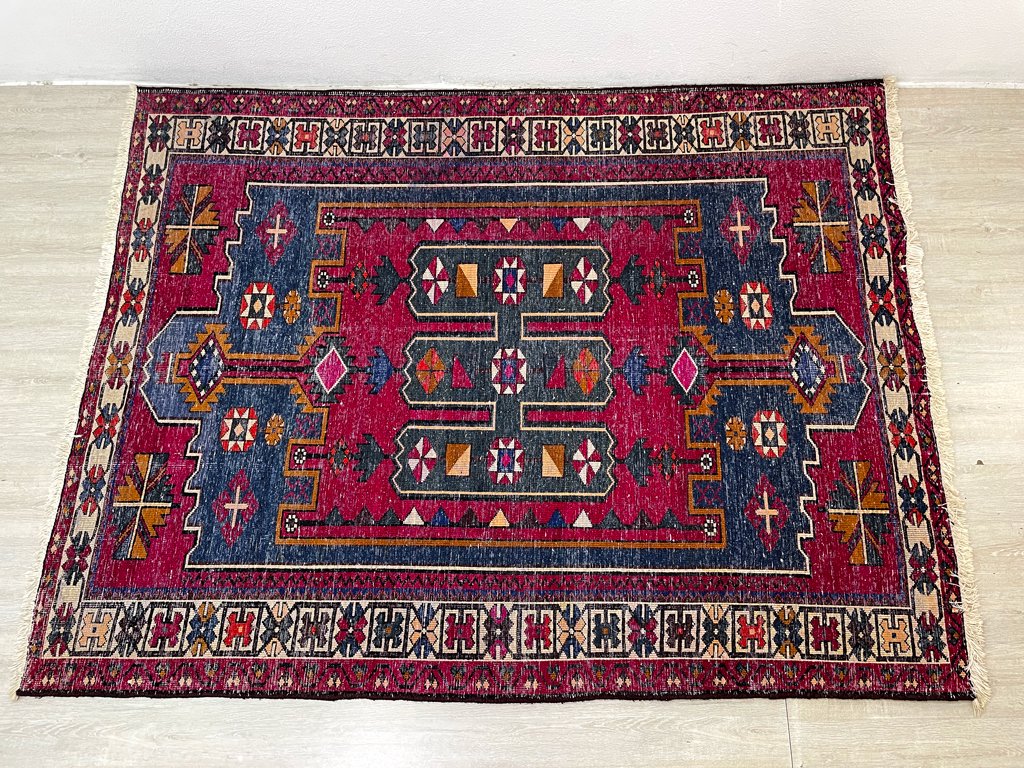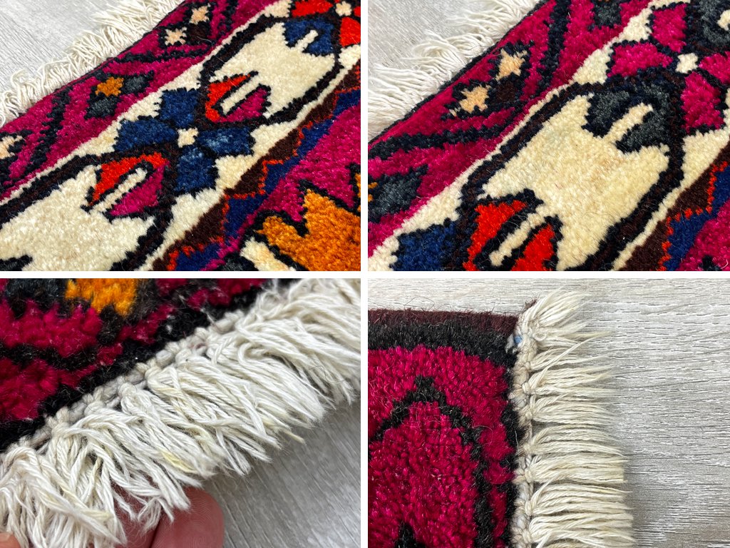 使用に伴い端のフリンジに小さな汚れやほつれなどが見受けられますが、その他目立つダメージは無く、全体的に使用感の少ないコンディションを保っております。今後も手織り絨毯ならではの風合いをお楽しみ頂きながら実用頂けます。