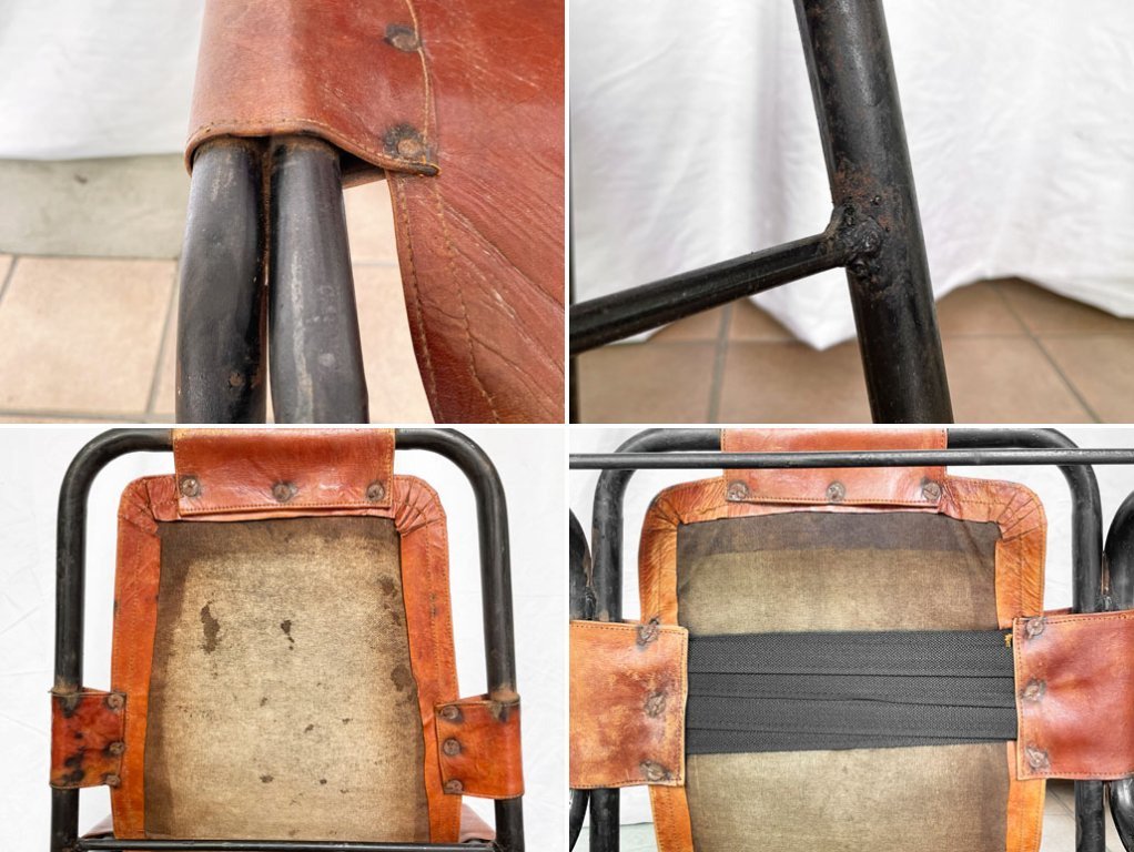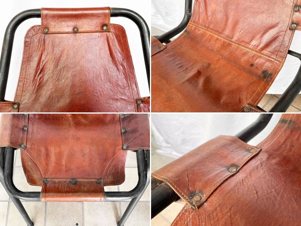 こちらはビンテージ品です。レザーには染み、色むら、しわや細かな表面のひび割れ、またフレームやリベットにも擦れやサビ等、経年なりのダメージはございますが、古いものならではの味としてお楽しみ頂けるかと思います。後年の補修により座面裏に取り付けられたウェービングがお尻に当たる感覚がございますが、着座に問題はございません。その他革の大きな伸び、破れやガタツキ等使用上問題となるダメージも無く、これからも安心してお使い頂けるコンディションです。床材保護の為キャップが取り付けられておりますが、不要の場合は取り外してお使い頂けます。