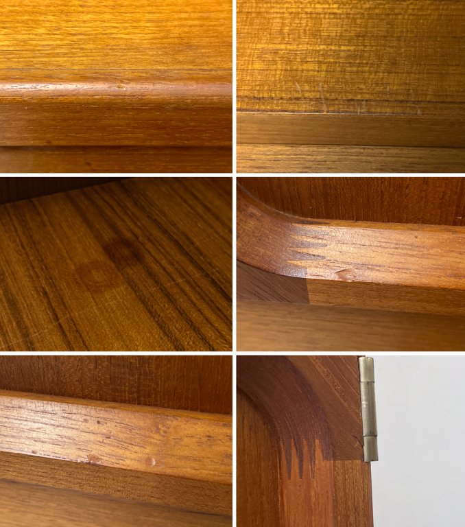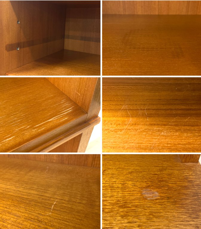 使用に伴う擦れや傷、小さな打痕がございます。棚板の設置場所沿って色焼けが見受けられます。