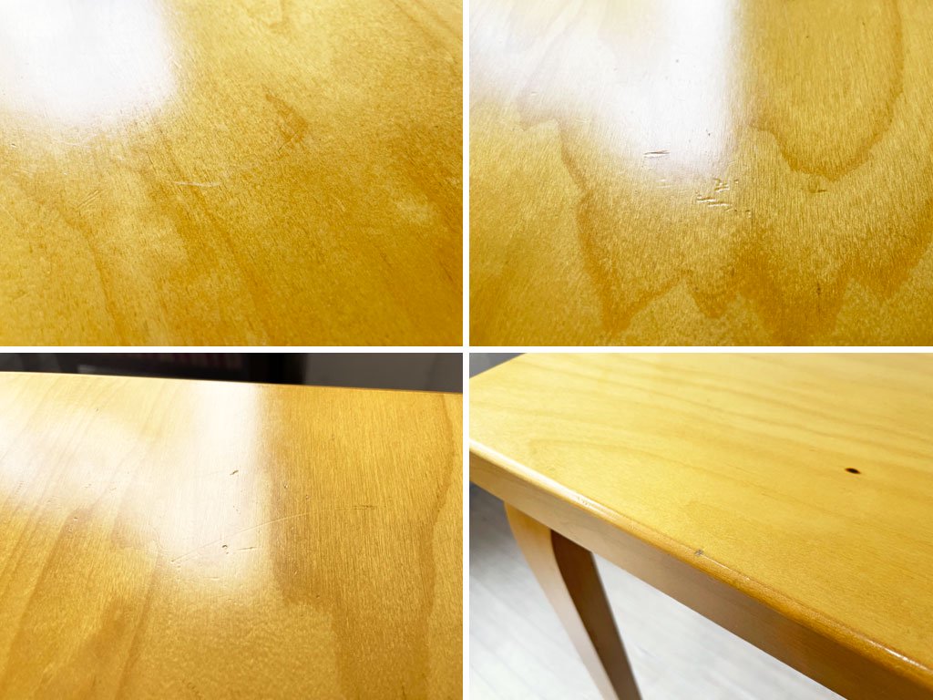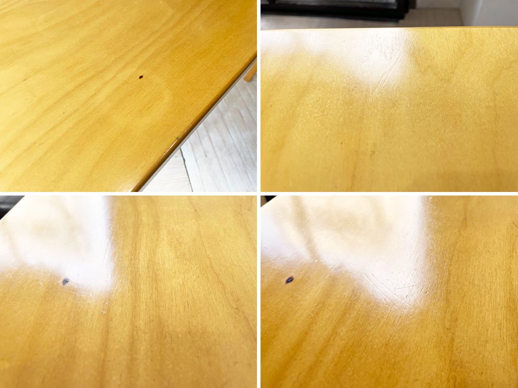 使用に伴う細かな傷や擦れ、打痕や細かな染みなどが複数見受けれられます。また、天板に薄い輪染みや僅かな焦げ跡が見受けられます。その他、色ムラや天板裏に多少の染み汚れがございますが、大きく目立つようなダメージなども無く、ガタつきやグラつきなどもございません。これからも安心してお使い頂けるコンディションを保っております。