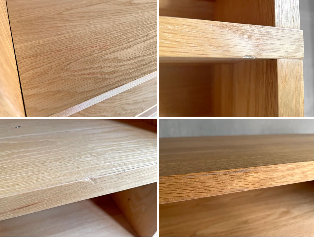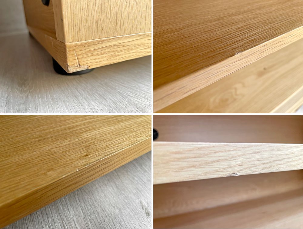 細かな打痕や線傷、突板の剥がれのほか、落としきれない色移りが見られるものの、極端に美観を損なうようなダメージは無く、中古品としては概ね良好なコンディションを保っております。