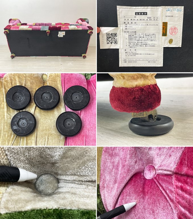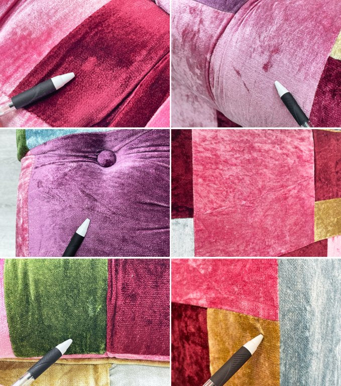 メディアやSNSによる発信、また有名タレントが使用していた事等、様々な要因も相俟って、その知名度は拡がり、ご自宅でのご使用は勿論、ショップやサロン等でも愛用されています。強烈なインパクトを残すカラフルなソファなので、周りの家具とのコーディネートも派手な色合いで組み合わせるかと思いましたが、インターネット上で参考例を探しますと、意外と周りの家具や内装はクラシカルやアンティーク、古材や無骨な工業系デザインと合わせ、シックにコーディネートされた空間も多く見られました。電球の光を用いた暗めのお部屋に対しても、決して悪目立ちすることなく、ベルベットの質感やボタン留めによる陰影が活かされ、程よくパッチワークの色合いが主張してくれます。