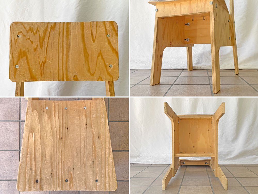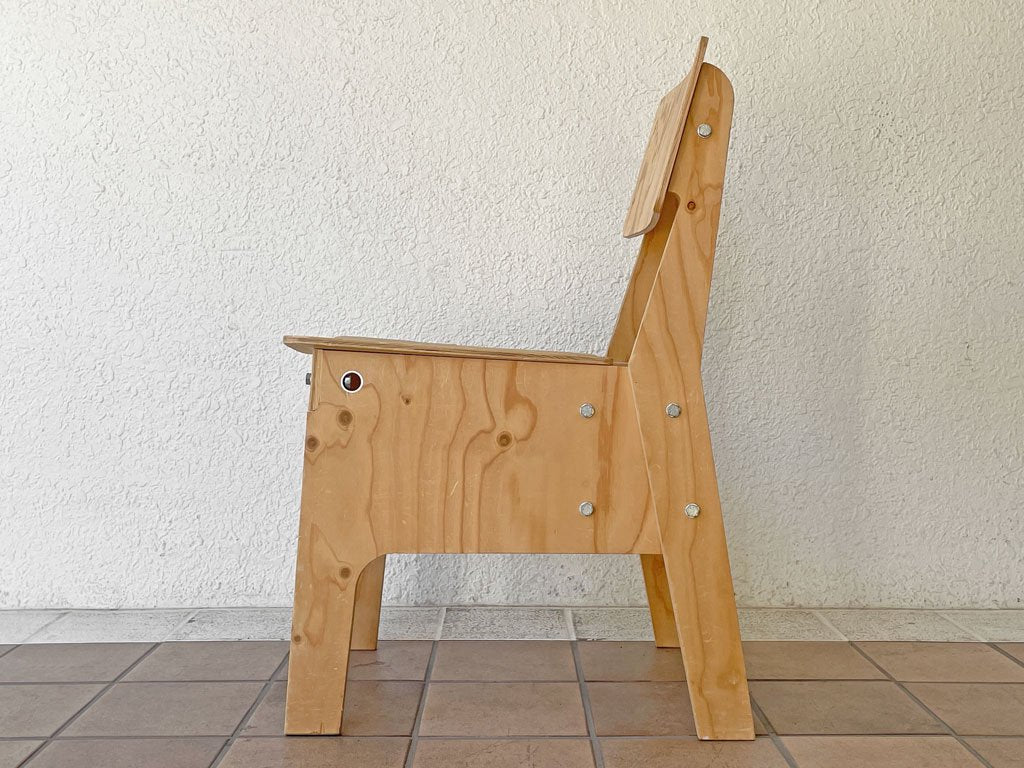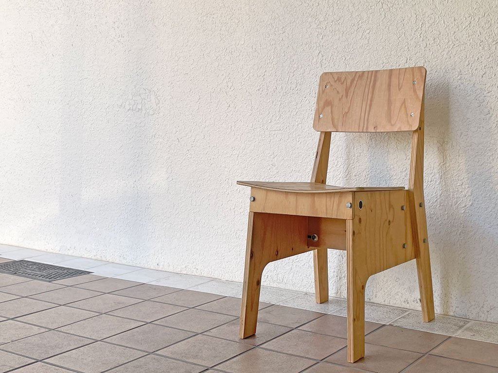 敢えて安価であるラワン合板を使用しており、化粧的な造形を一切省いた実直なフォルムが特徴的で、合理的かつ的確な設計構造を垣間見ながらも実際に座って体感する事ができる逸品となっております。
