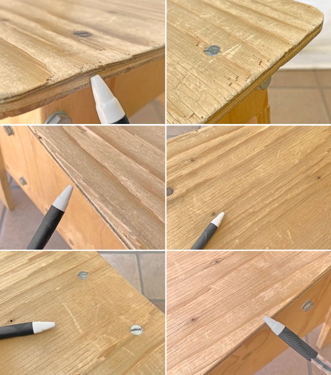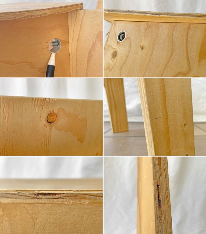 使用に伴う擦れ傷の他、打痕、スクラッチ、線傷、突板の剥がれやそれに伴うささくれ等が全体的に見受けられやや使用感がございますが、大きく風合いを損なうものではございません。ほかボルトを留めるナットが1箇所欠品しておりますが、複数箇所で支える構造のため通常のご使用においては問題となるものではございません。グラつき等は無く、今後とも雰囲気を楽しみながらご実用頂けるコンディションを保っております。