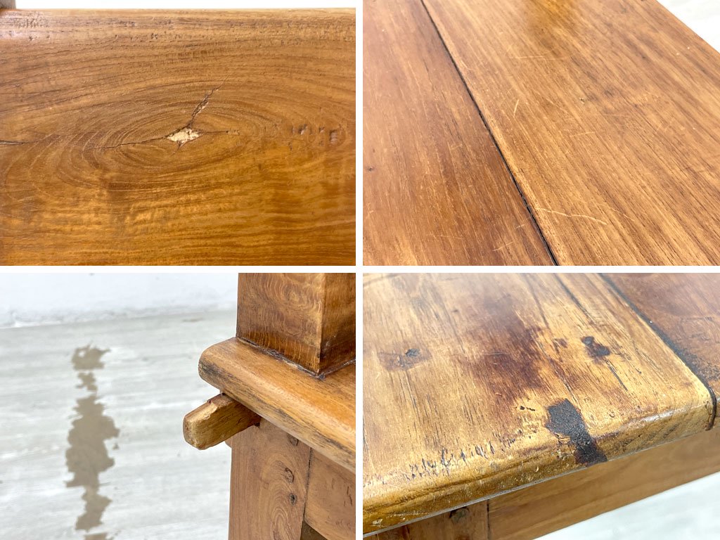 使用に伴う擦れや傷、打痕、木部のひび割れ、木部のカケ、染みなどが散見されますが、美観を大きく損ねるような汚れや、機能を損なうような大きなダメージなどは特にございません。