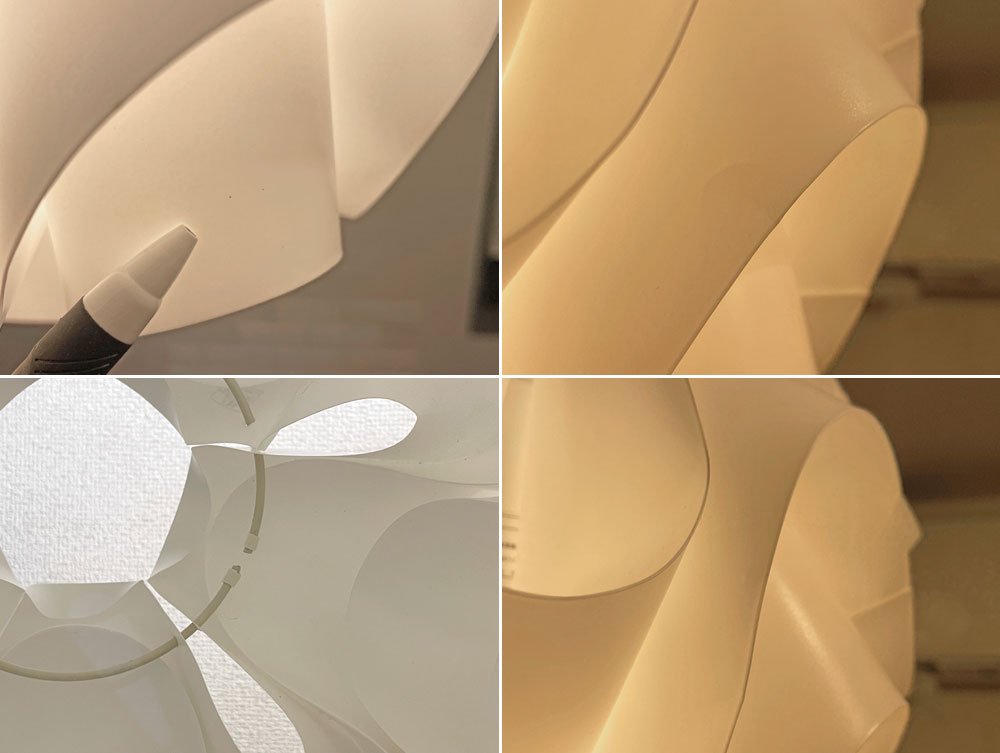 1枚のプラスティックシートを規則的に折り曲げる、正弦曲線(サイナスライン)を取り入れたデザインは日本の折り紙をヒントにしたもの。