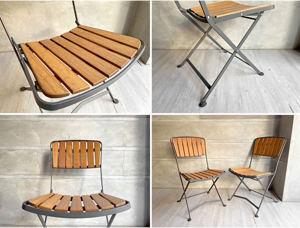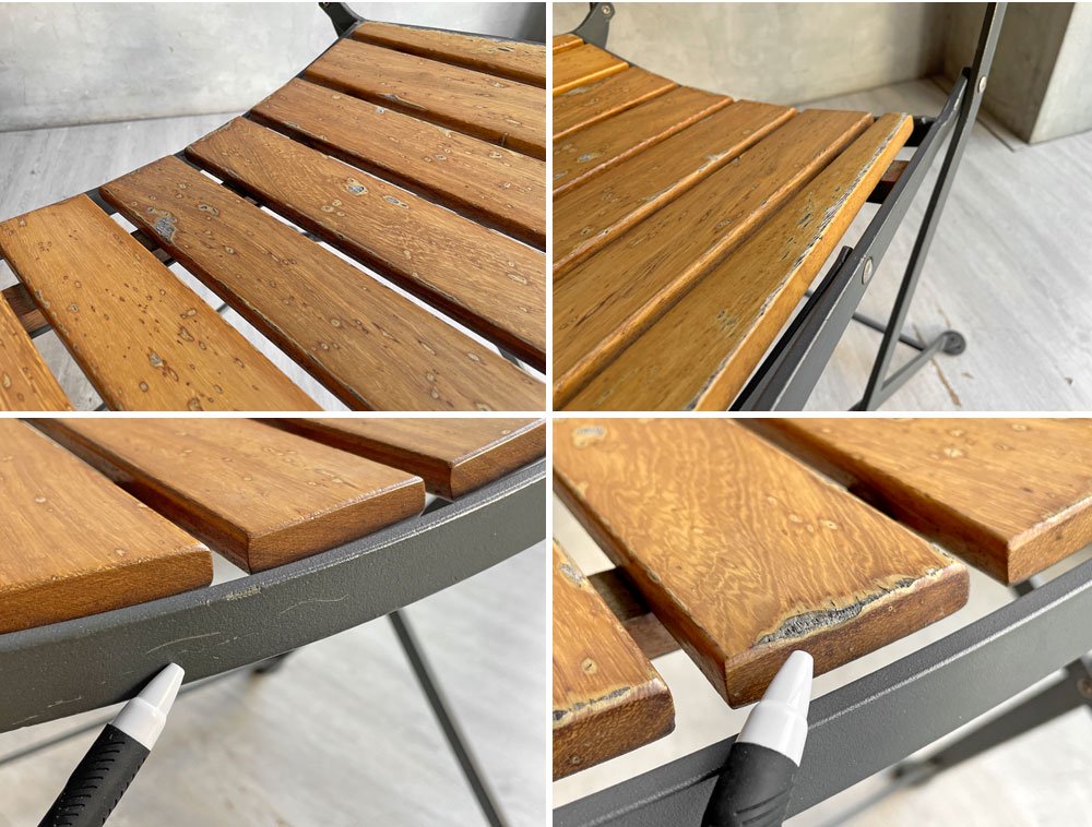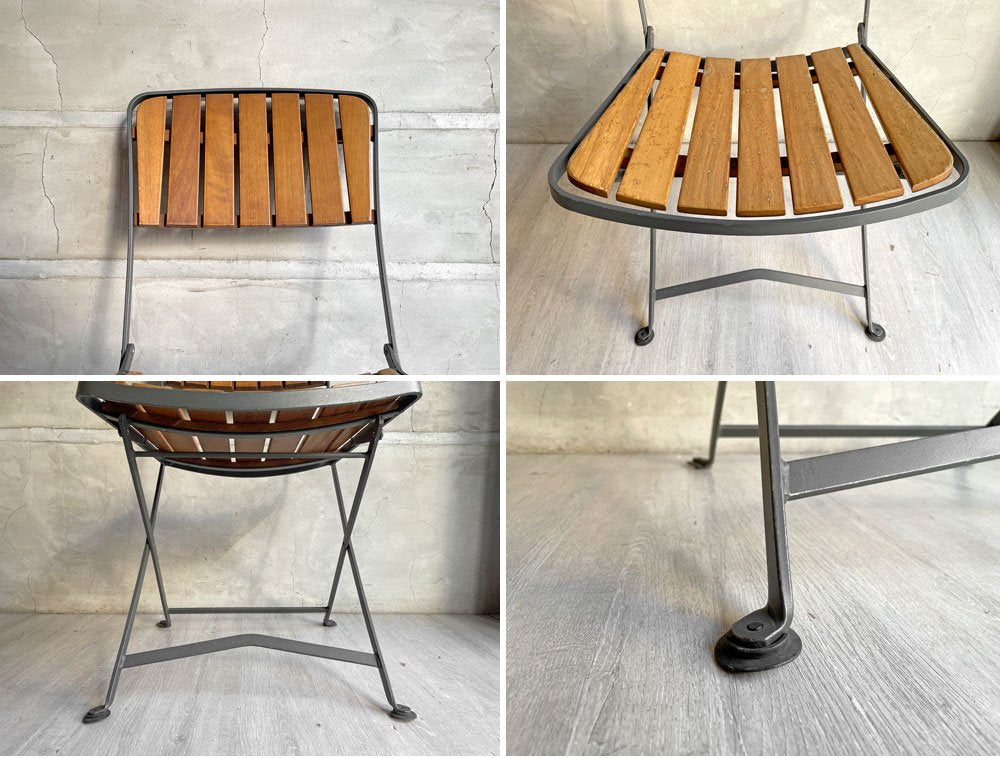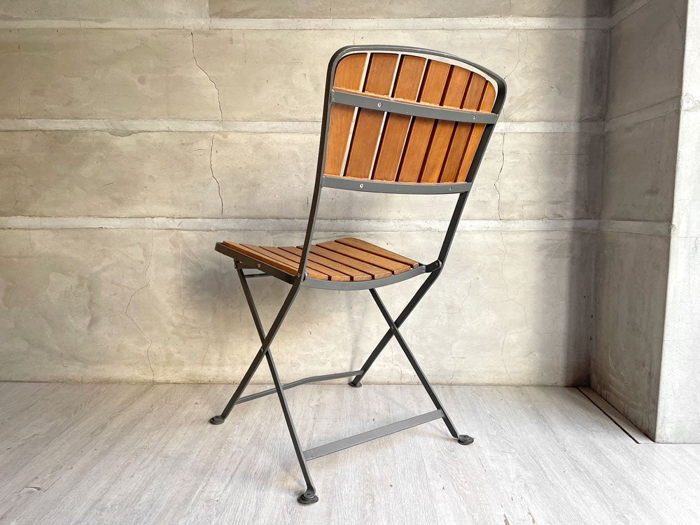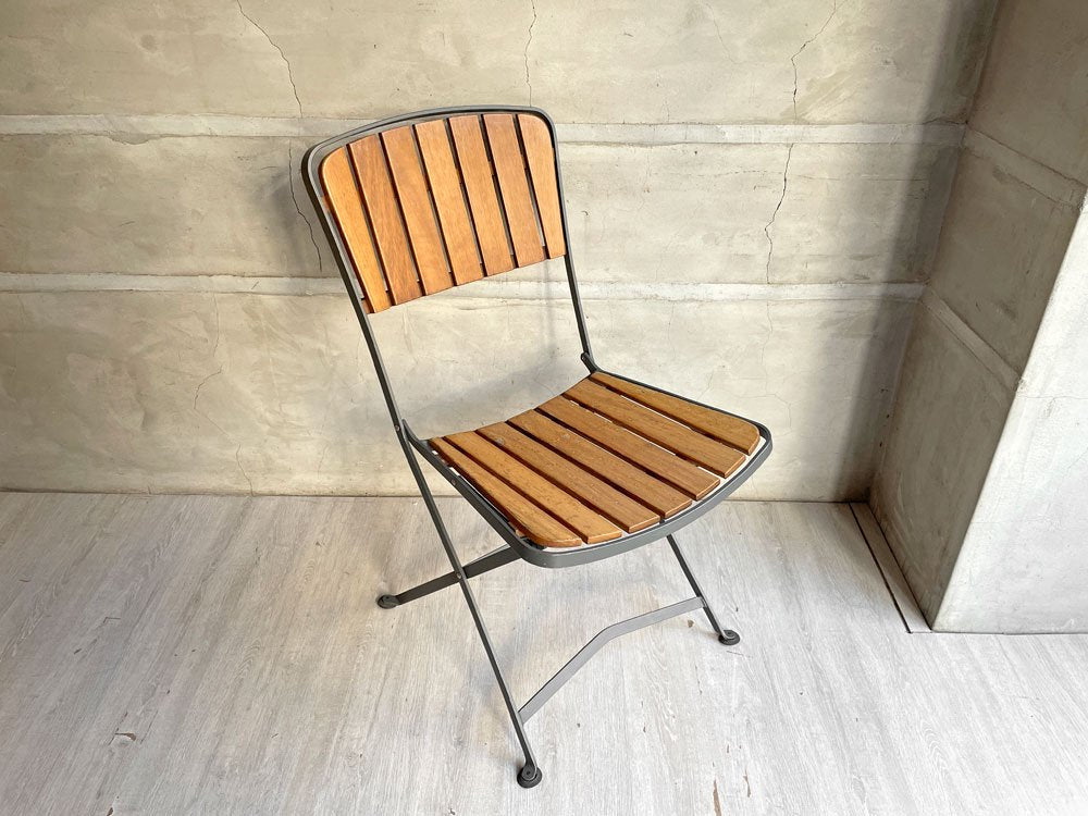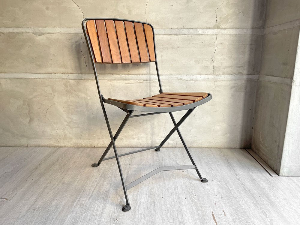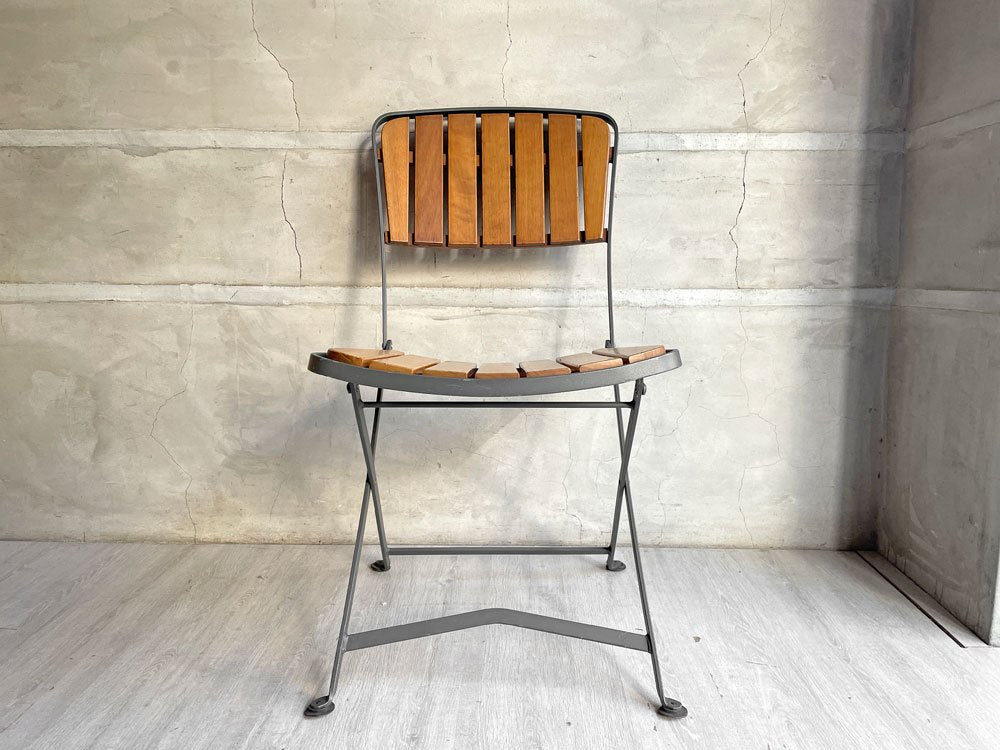 こちらのガーデンチェアは、アイアンとウッドを組み合わせた無骨なフォルムが特徴的なモデル。