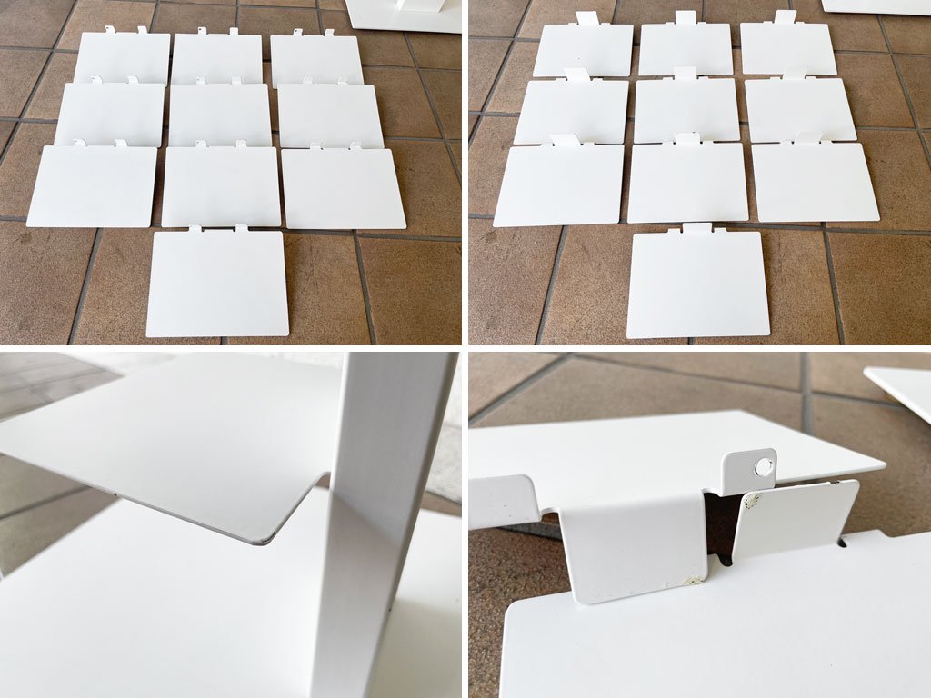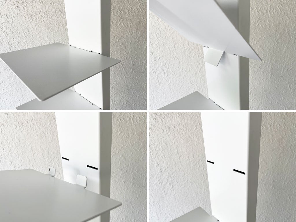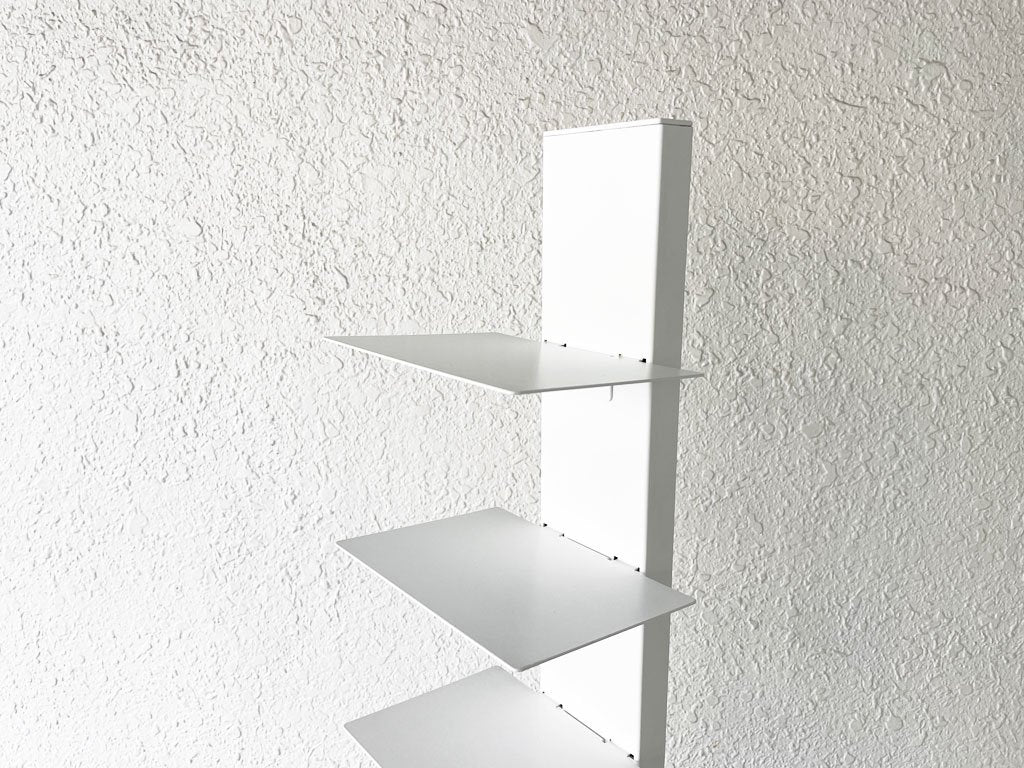 等間隔に配置された棚板×10枚に書籍やCD・DVD等、無造作に積み上げれば、整理しながらにしてその背表紙がそのままインテリアアクセントとなるユニーク且つ洗練されたミニマルデザイン。