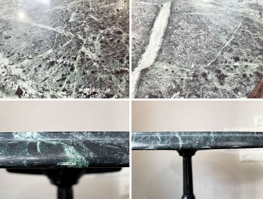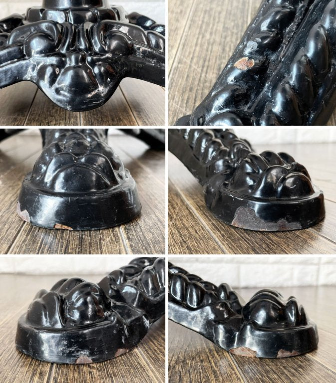 天板には側面から裏面にかけて3箇所、1円玉ほどの大きさの欠けがございます。また、天板には擦れ傷や線傷がございますが、こちらはマーブル模様と相まってさほど気にならない程度かと思われます。なお、脚部には擦れや傷のほか塗装剥がれにより錆が生じている箇所がございます。その他、天板裏のボンドのような付着汚れやアイアン部分のくすみ、取り切れない汚れ等はございますが、ご使用は問題なく行えるコンディションを保っております。