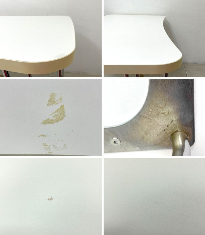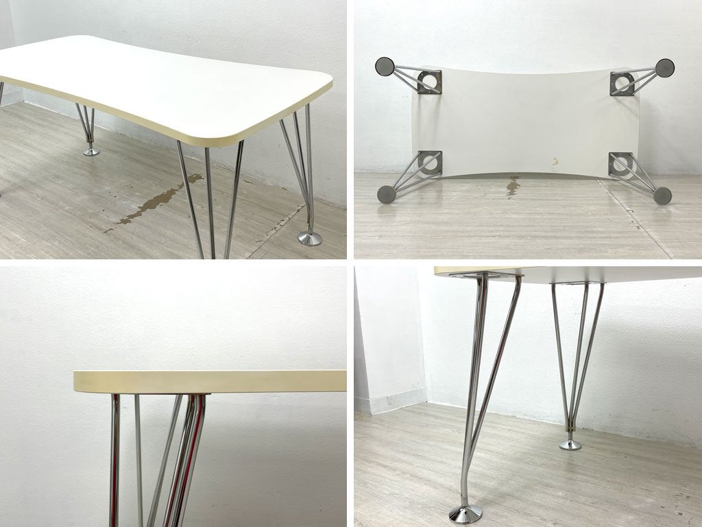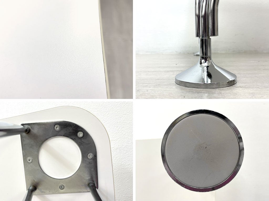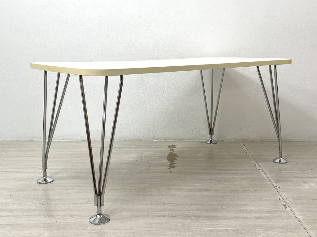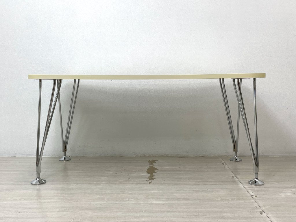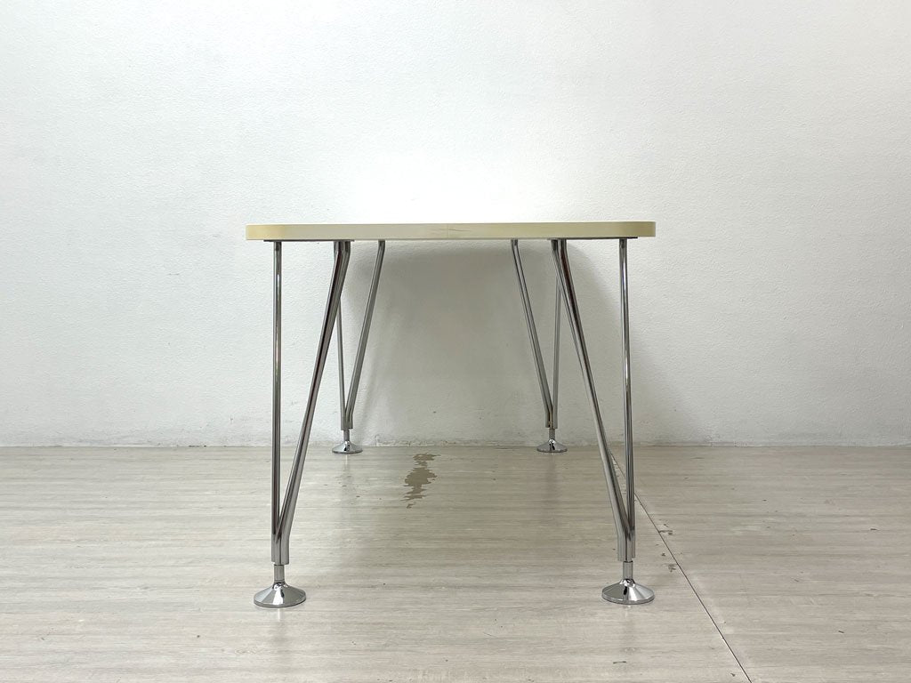 ホワイトラミネートトップにより、傷や汚れに強い素材で仕上げられ、ダイニングテーブルとしては勿論、ワークテーブルやオフィスの会議用テーブルとしても活躍出来るつくり。光沢のある軽量なクロームメッキスチールでできたレッグは、全体に程良いメリハリを加えています。