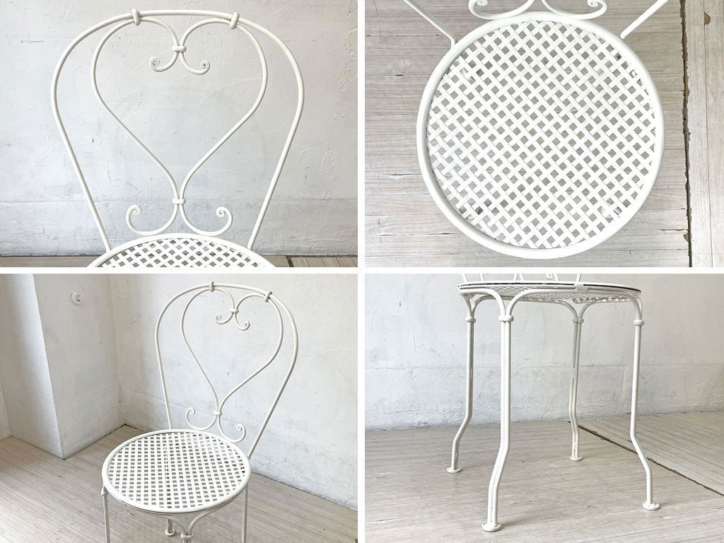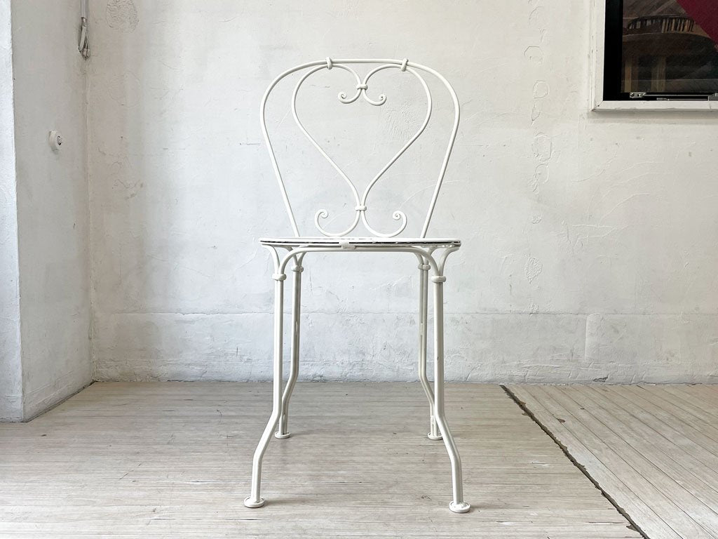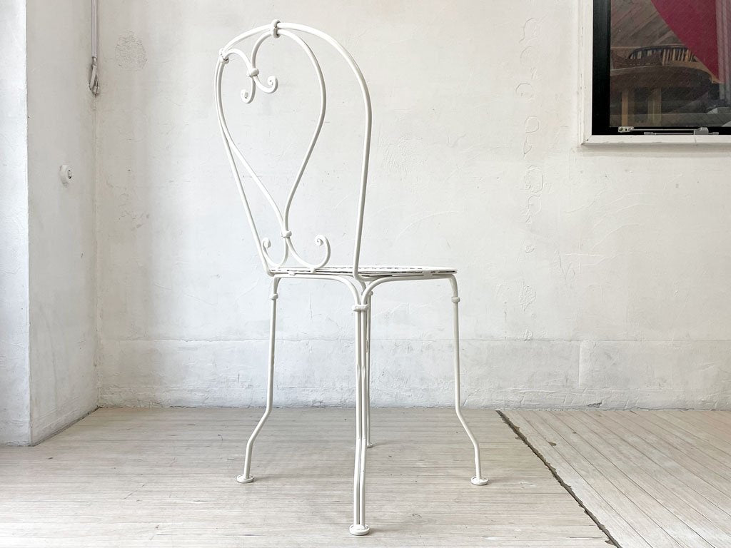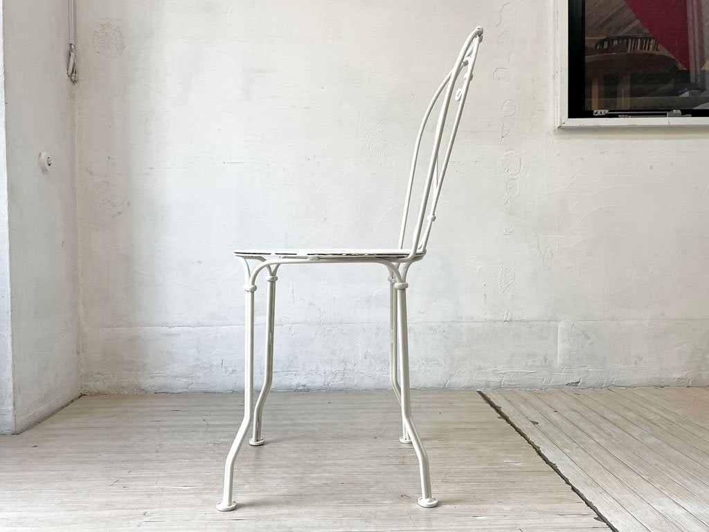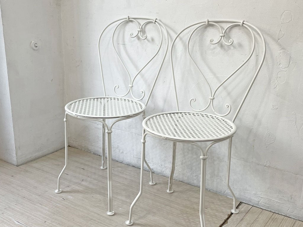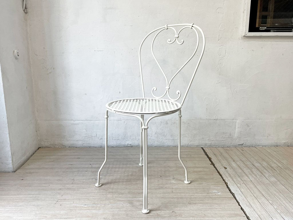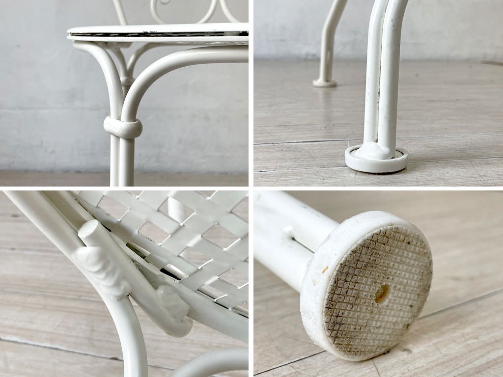 スチール製の本体にホワイトカラーの塗装が施された、アンティークスタイルのガーデンチェア。