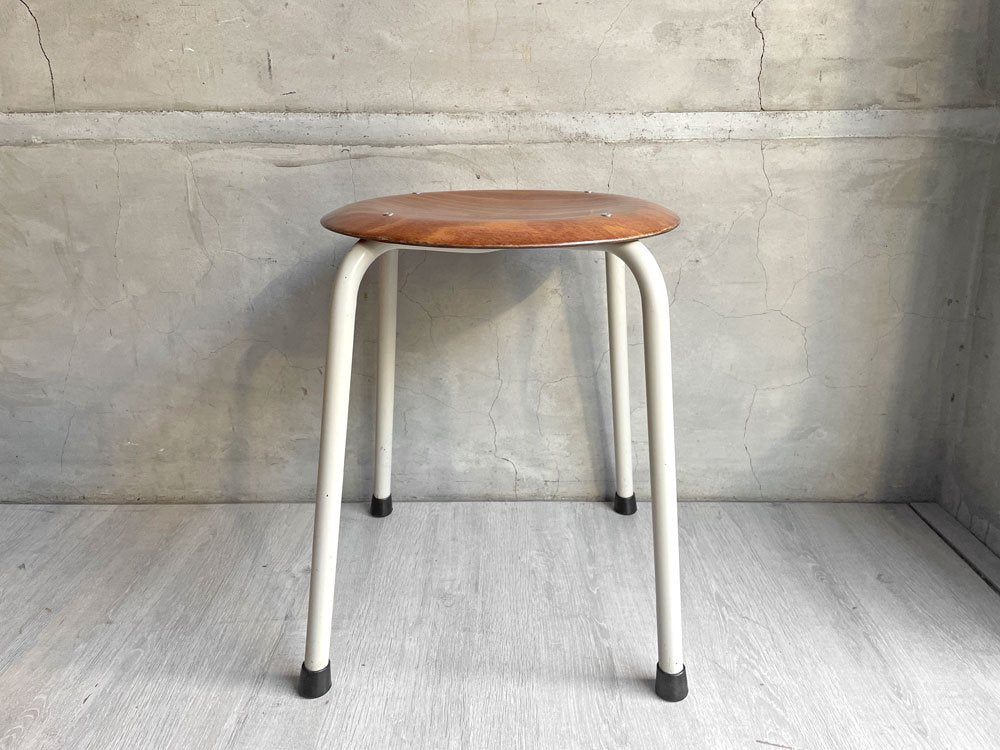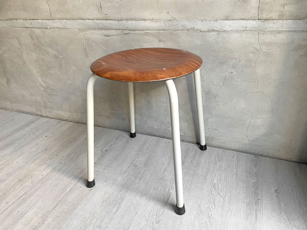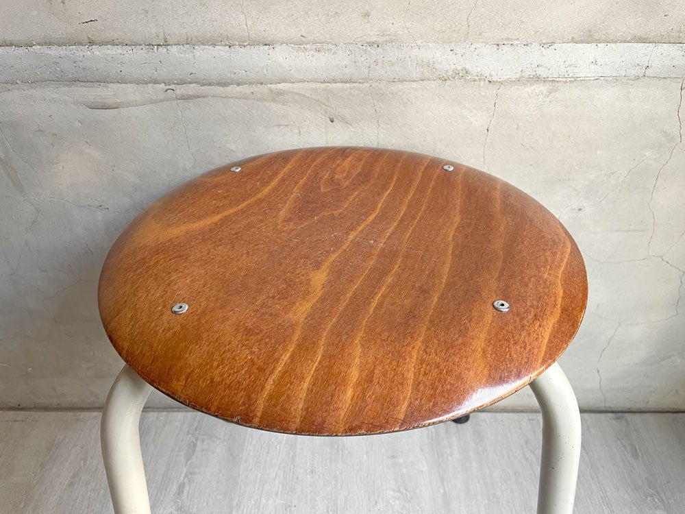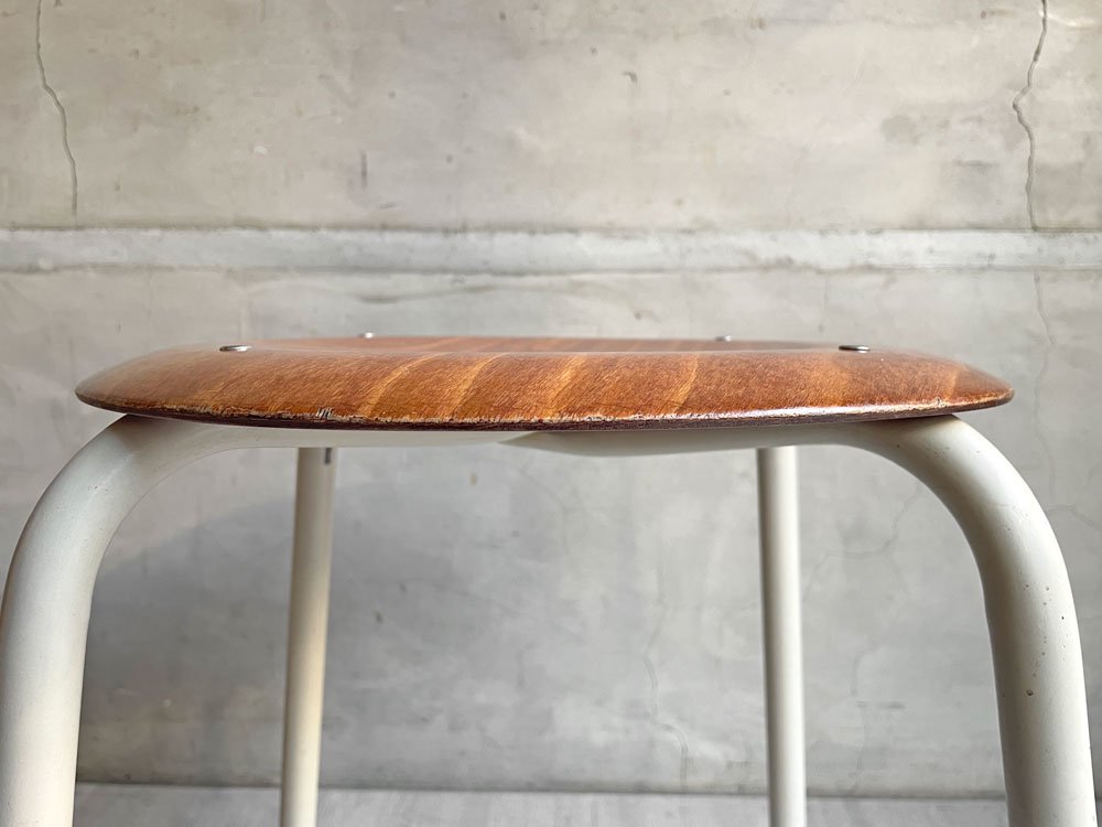 ビンテージ Vintage ウッドシート × スチールレッグ スツール スタッキング プライウッド アイボリー インダストリアル A ♪