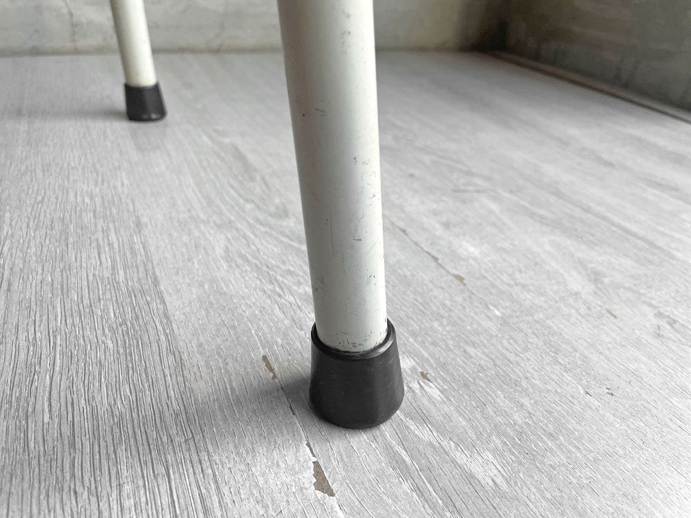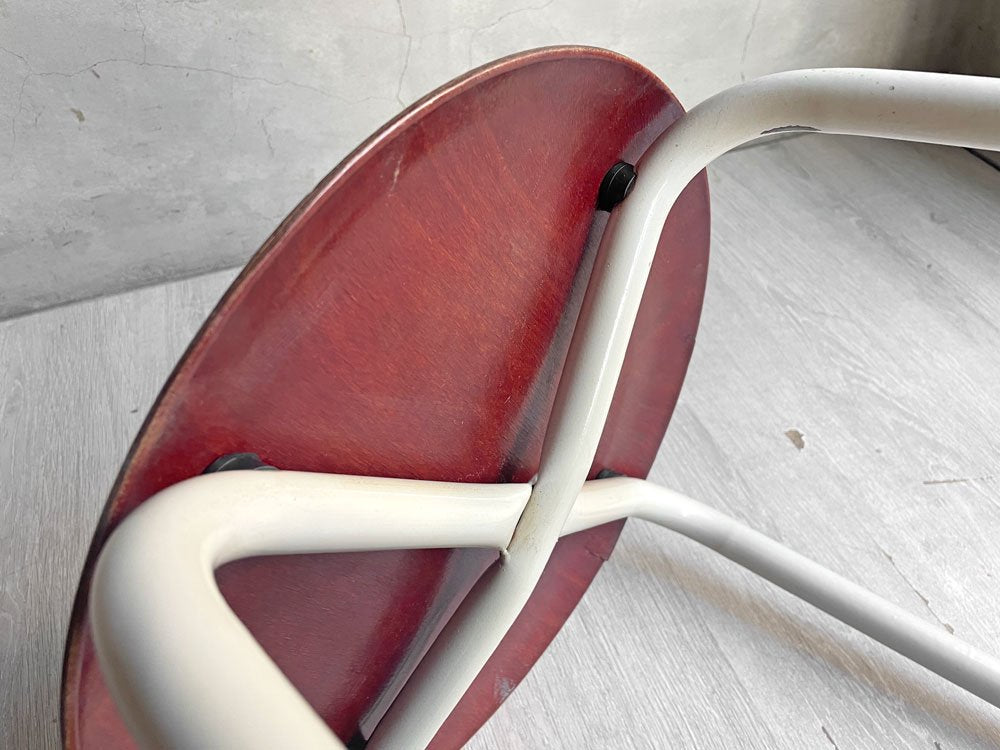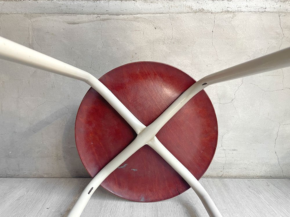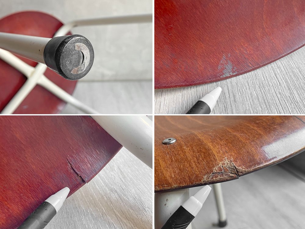 こちらはビンテージのお品物です。使用・経年に伴い、木製の座面には擦れや割れ、インク跡が見受けられます。脚部には線傷や打痕、スタッキングに伴うペイントロス、脚先のゴムには損傷が見受けられます。多少の使用感はございますが、ビンテージの風合いとしてお楽しみ頂けるコンディションを保っております。