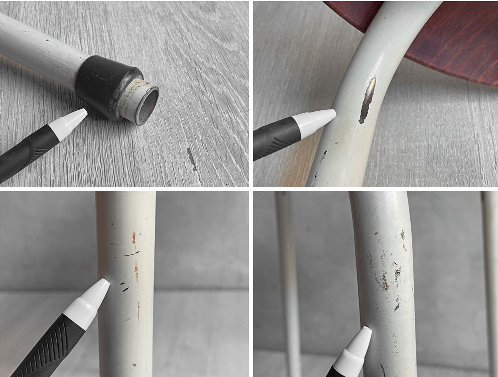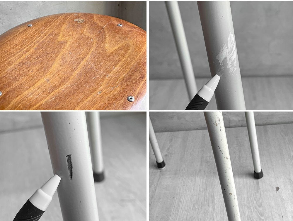 こちらはビンテージのお品物です。使用・経年に伴い、木製の座面には擦れや線傷、木肌の色味が薄くなっている箇所が散見されます。脚部には線傷や打痕、スタッキングに伴うペイントロス、脚先のゴムには損傷が見受けられます。多少の使用感はございますが、ビンテージの風合いとしてお楽しみ頂けるコンディションを保っております。