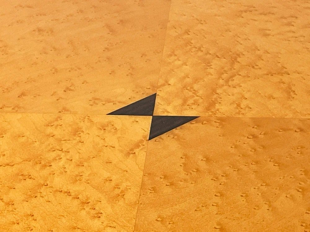また天板は「マス張り」と呼ばれるX状にクロスさせ突き板を張り合わせる高度な加工技術を採用。バーズアイの有機的な表情に対して、直線構成がモダンな印象を強調させています。天板表面には、バーズアイメープルの神秘的な美しさを一層引き立たせる艶やかなコーティングを施し、高級感を漂わせています。