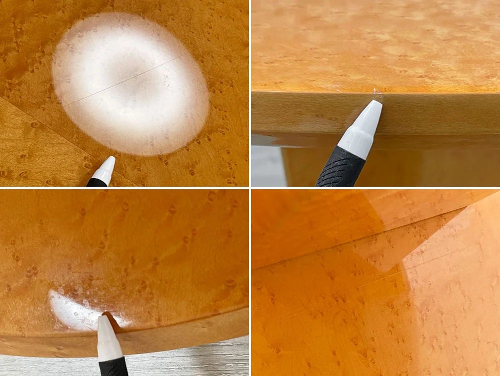 使用に伴い天板を中心に細かな擦れや線傷、光の加減で見える程度の輪染みや水垢、縁に打痕などが見受けられます。