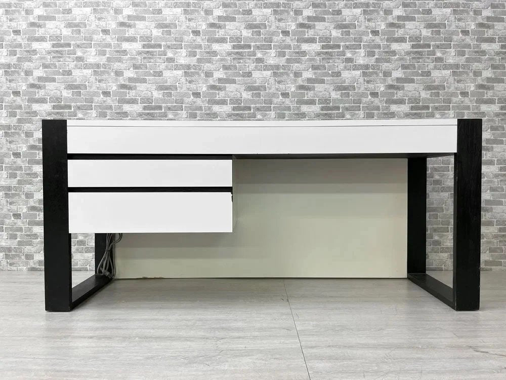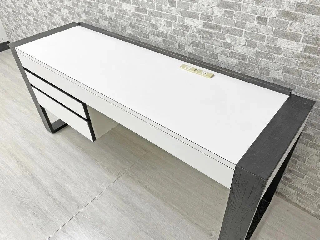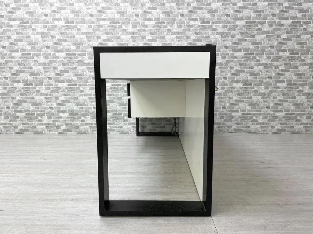 同ホテルのシングルルーム等に設置されていたこちらのデスクは、ホワイトメラミン板とブラック塗装が施されたオーク材フレームによるツートンカラー。ブラックフレームの塗装面は程よく杢目の表情を残しています。直線を基調としたシンプルなフォルムにより、エッジを効かせた色彩構成とカラーコントラスト、素材そのものの美しさを強調させています。