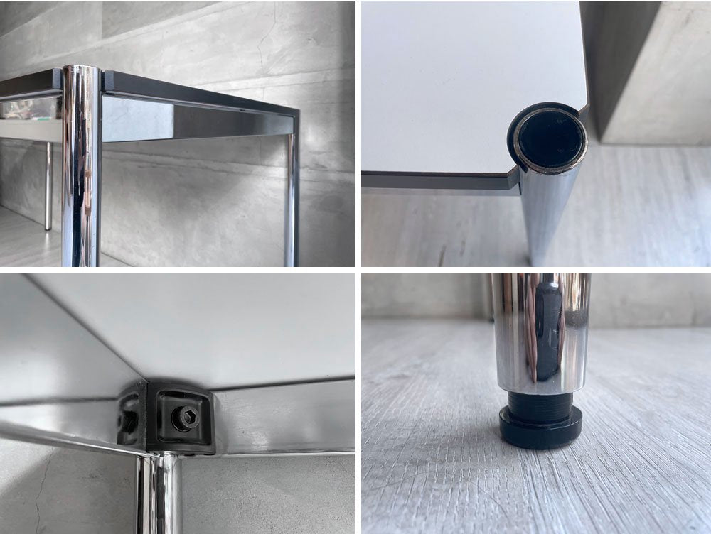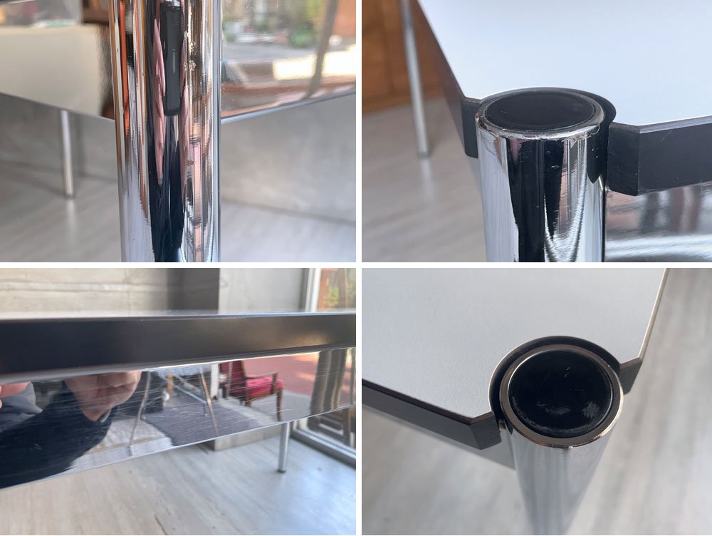 パールグレーラミネート(ホワイト)の天板と、クロームの丸脚4本で構成した直線構造。