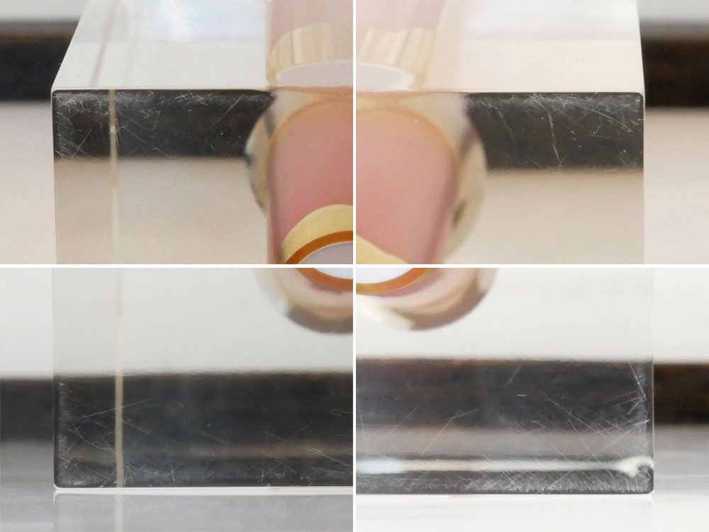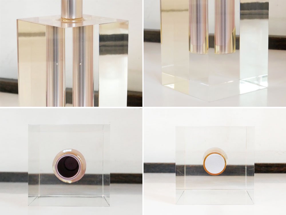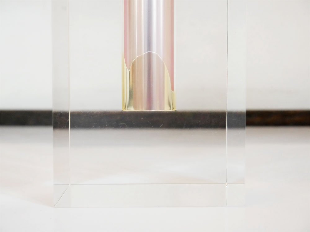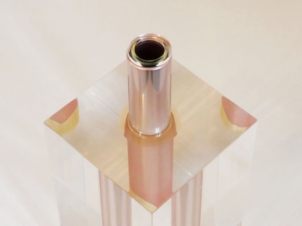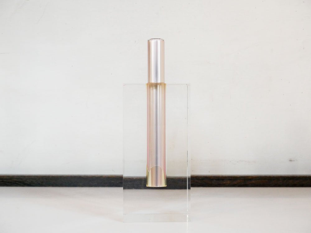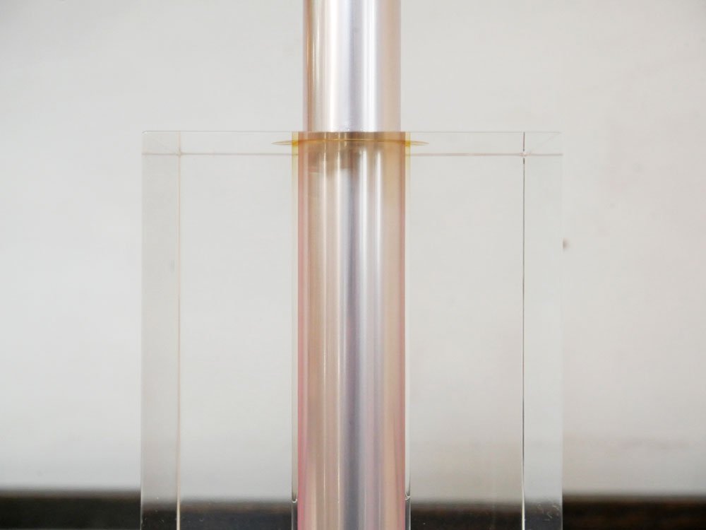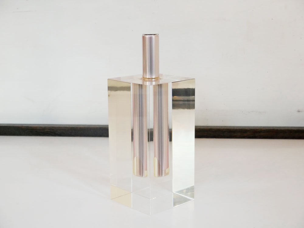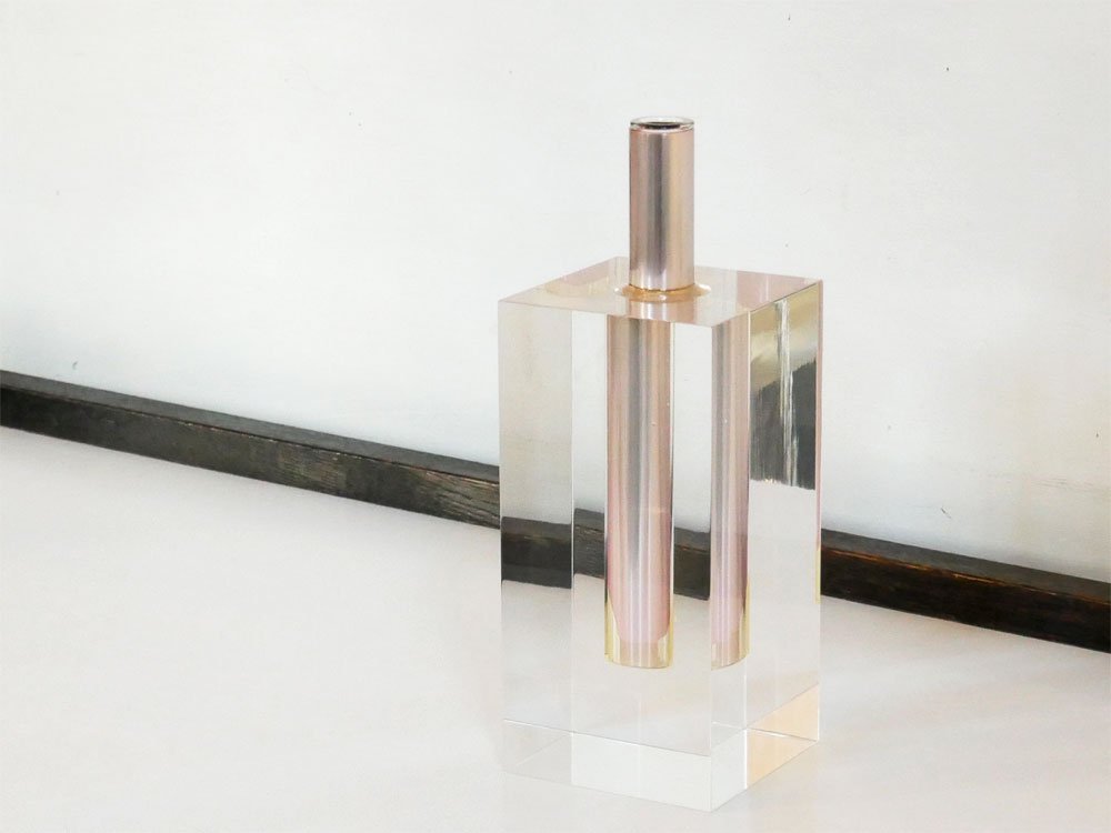 「霧のような表情」を作り出すアルマイトの淡い色彩が美しい、アクリルブロックとアルミパイプを用いた一輪挿し。