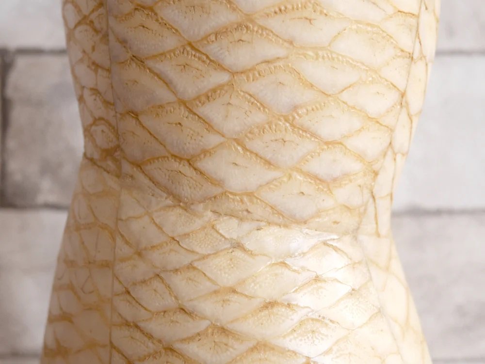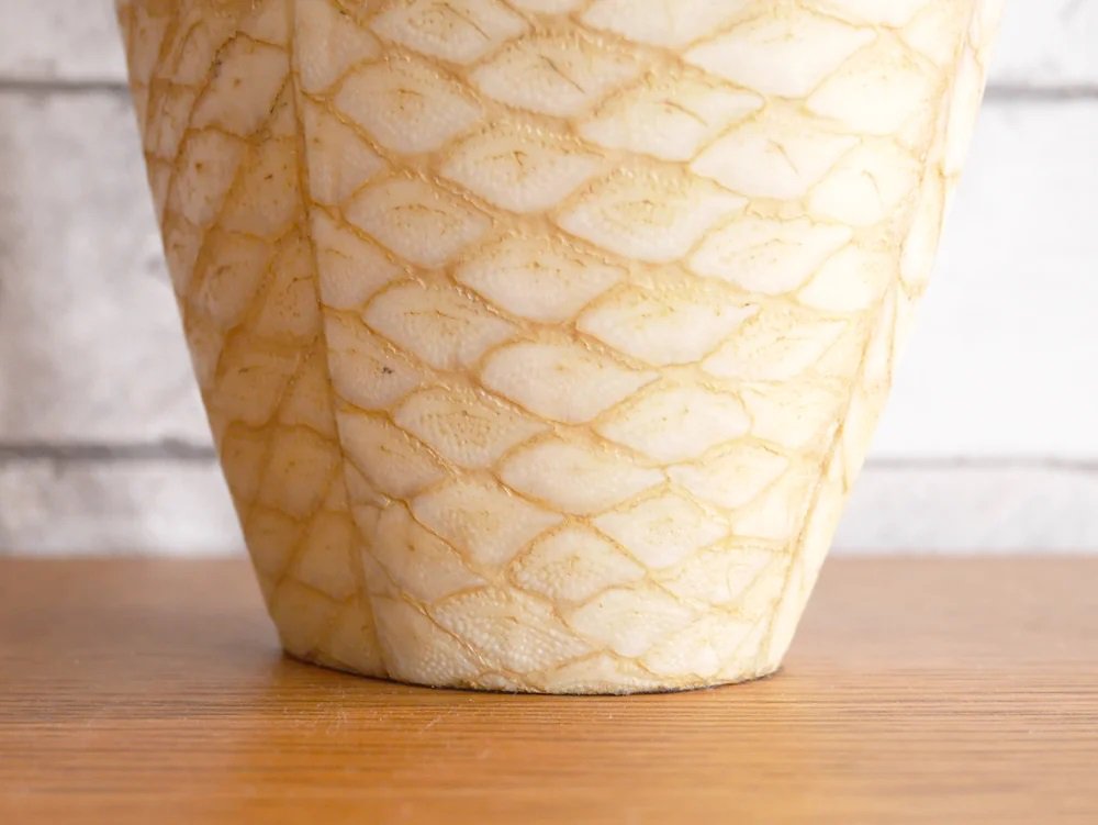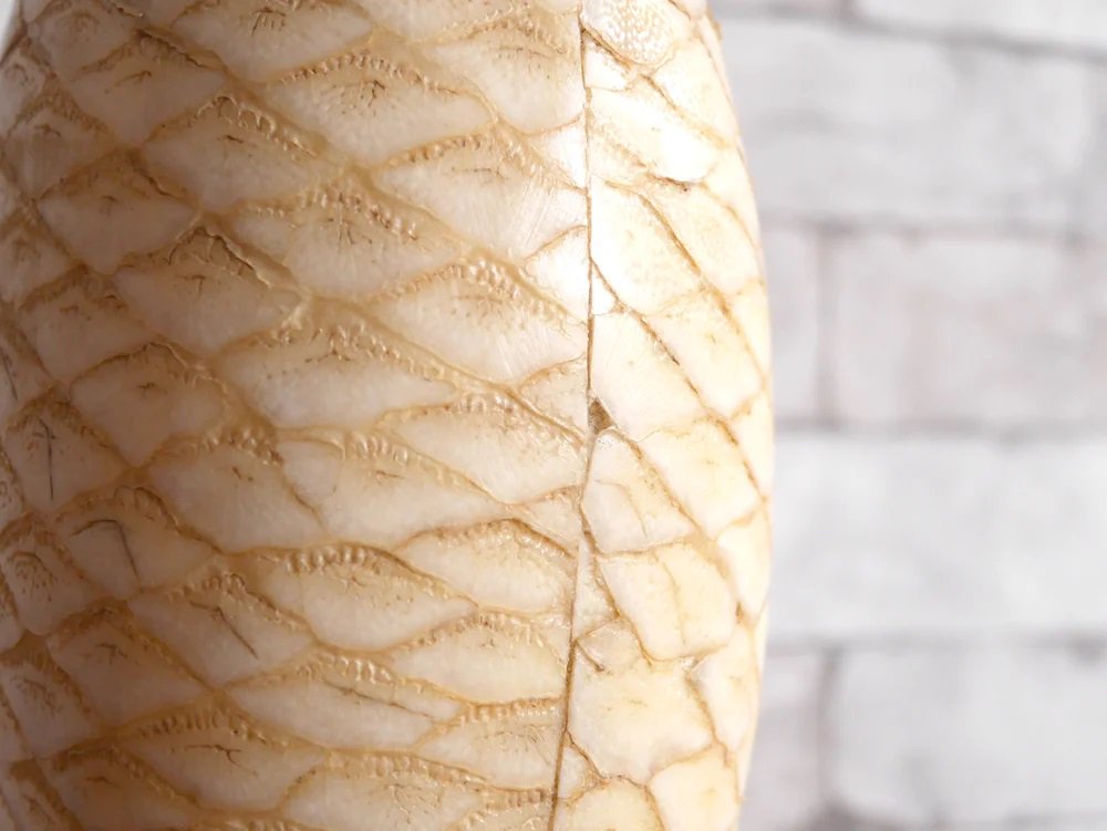 マホガニー材を下地にヘビ革が張られたエキゾチックなデザインのこちらのフラワーベースは、フィリピンの熟練の職人によるハンドメイド。