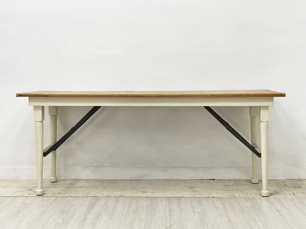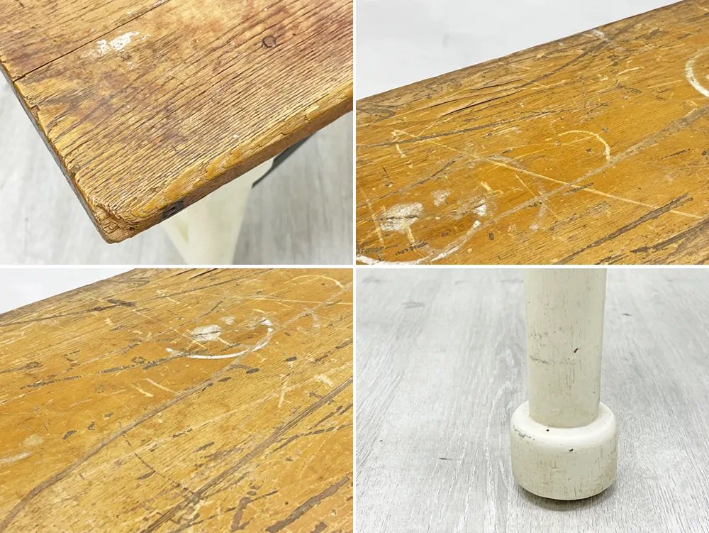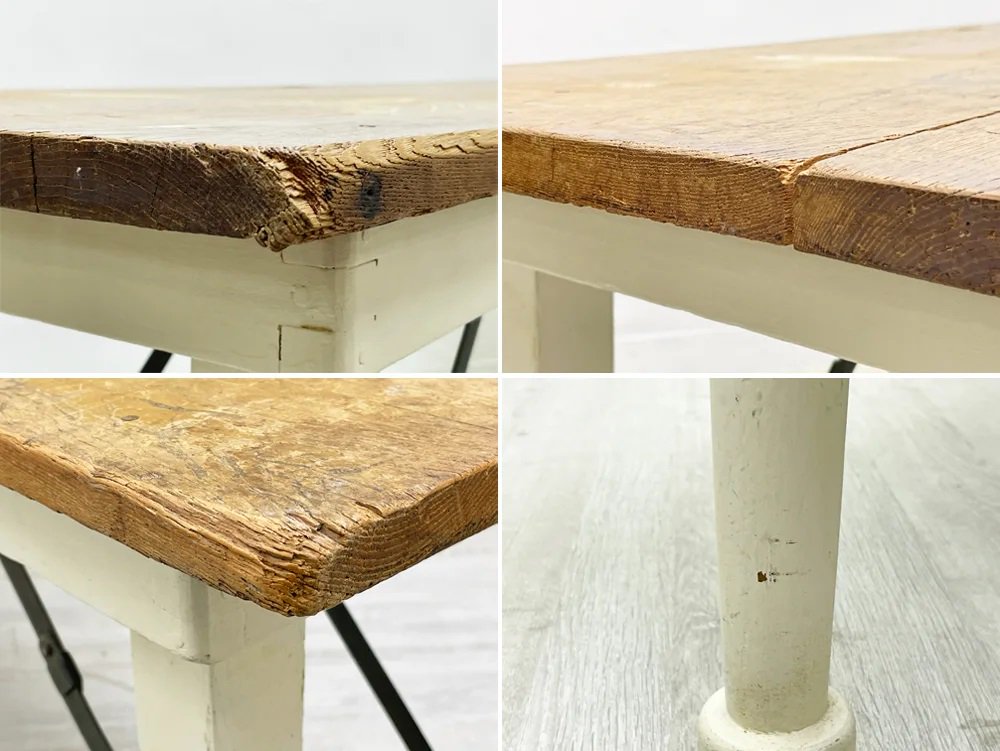 天板は使い込まれた木のヤレ感を、脚部にはアイボリー色のペイントによる程よい塗装剥がれが見られ、ビンテージならではのシャビーな仕上がりが魅力となっております。