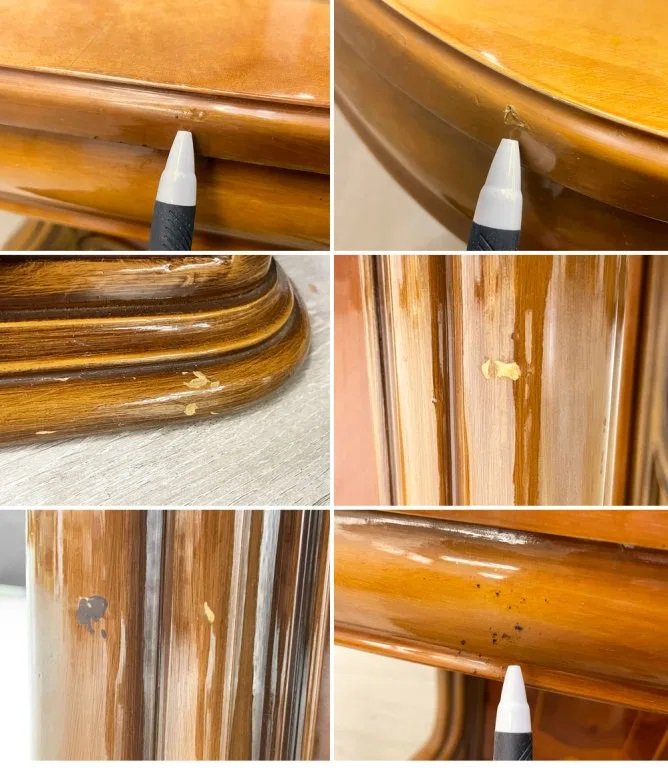 使用に伴い、天板には線傷や打痕、脚部には打痕によるペイントロスがございます。その他大きなダメージも無くこれからも実用頂けるコンディションを保っております。