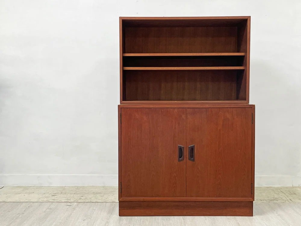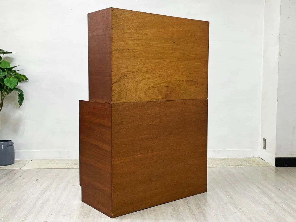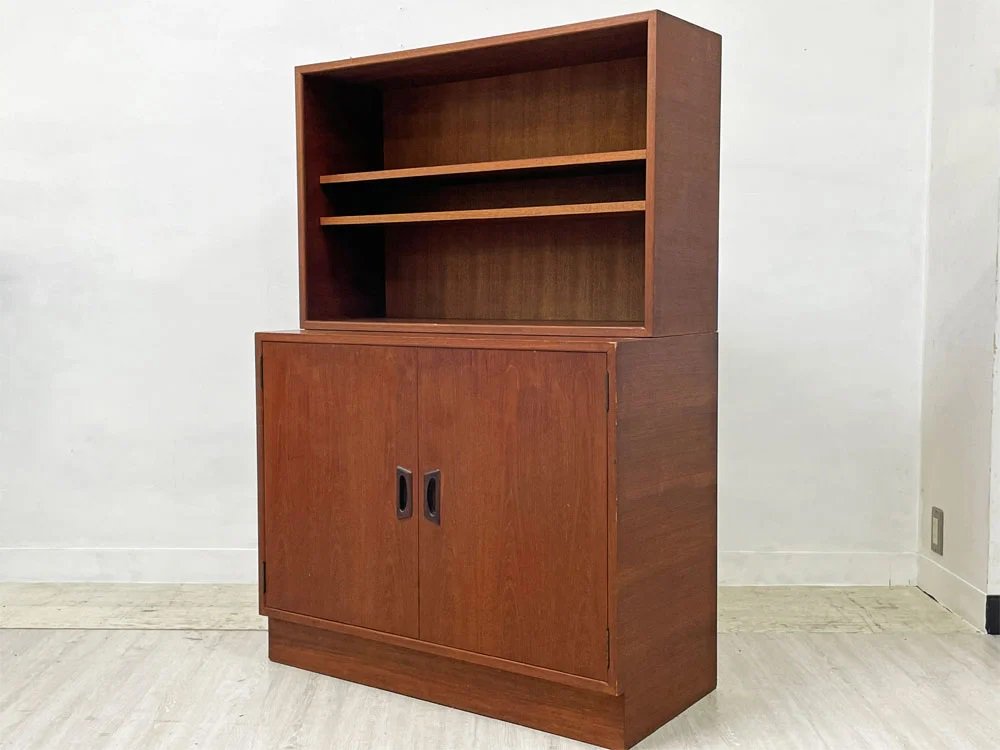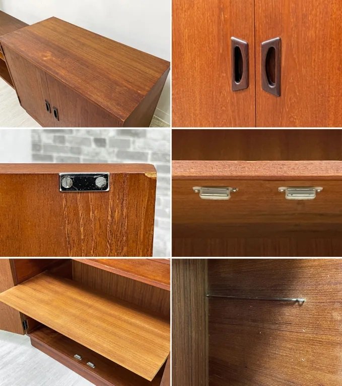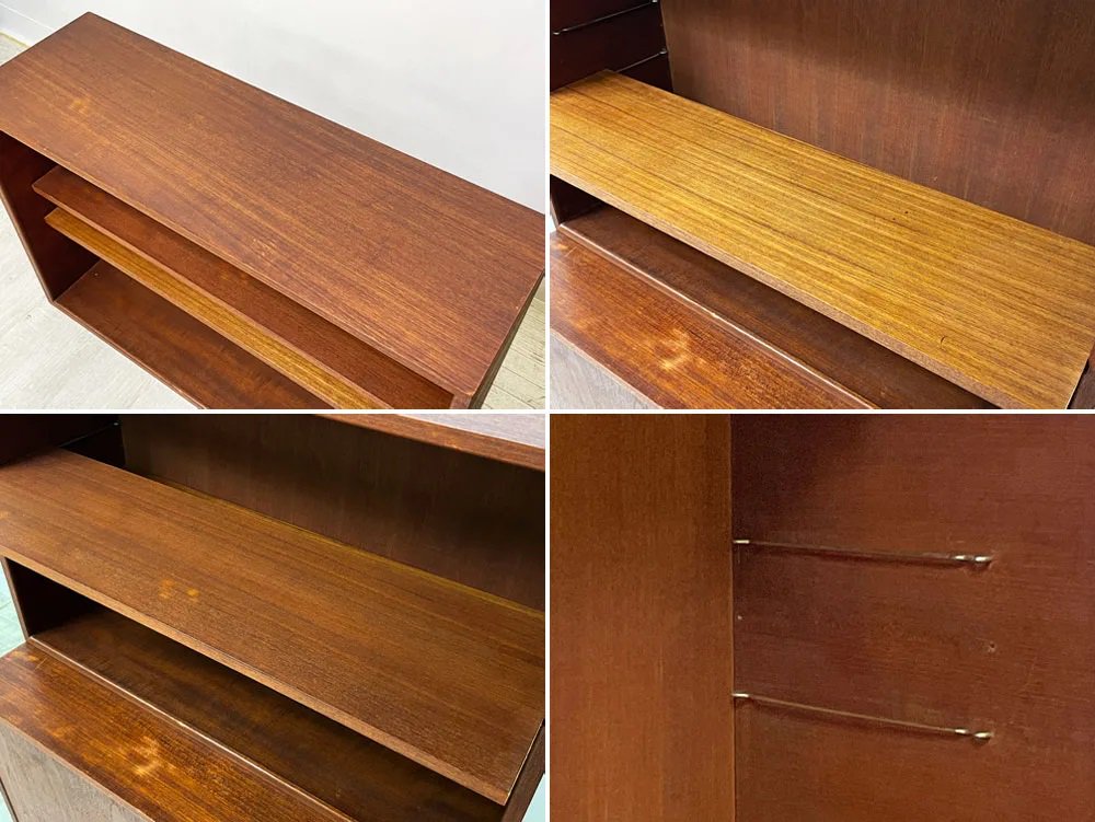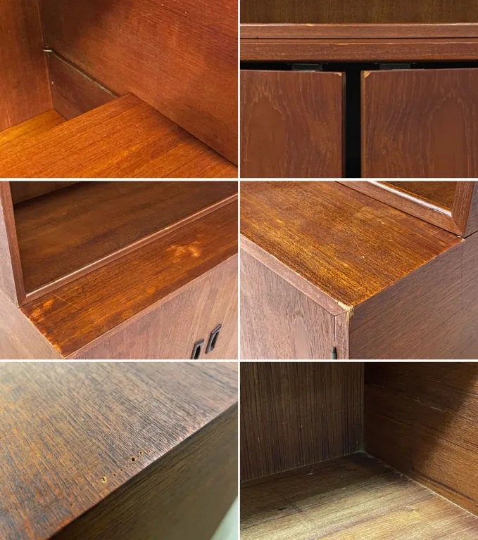 日本らしい几帳面な造りの中にも、無垢材をくりぬいた把手や左右対称に木目をそろえたブックマッチ仕様、棚板もスライド式といった北欧の名品を踏襲した高い再現が当時の熱量を感じさせる1台。