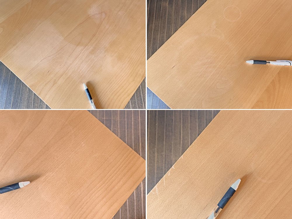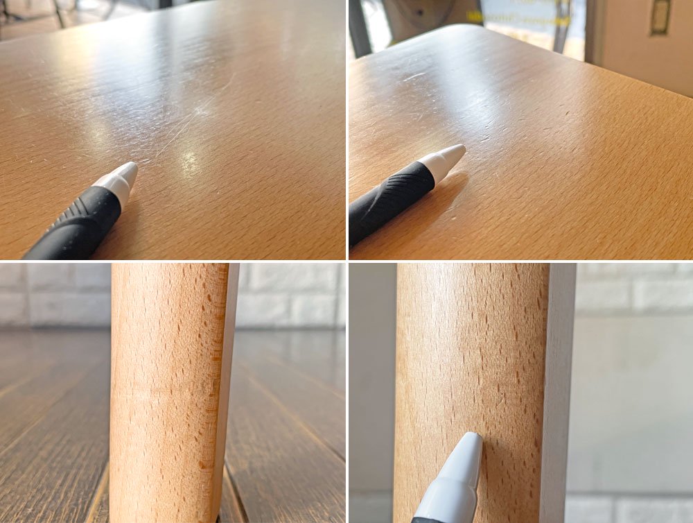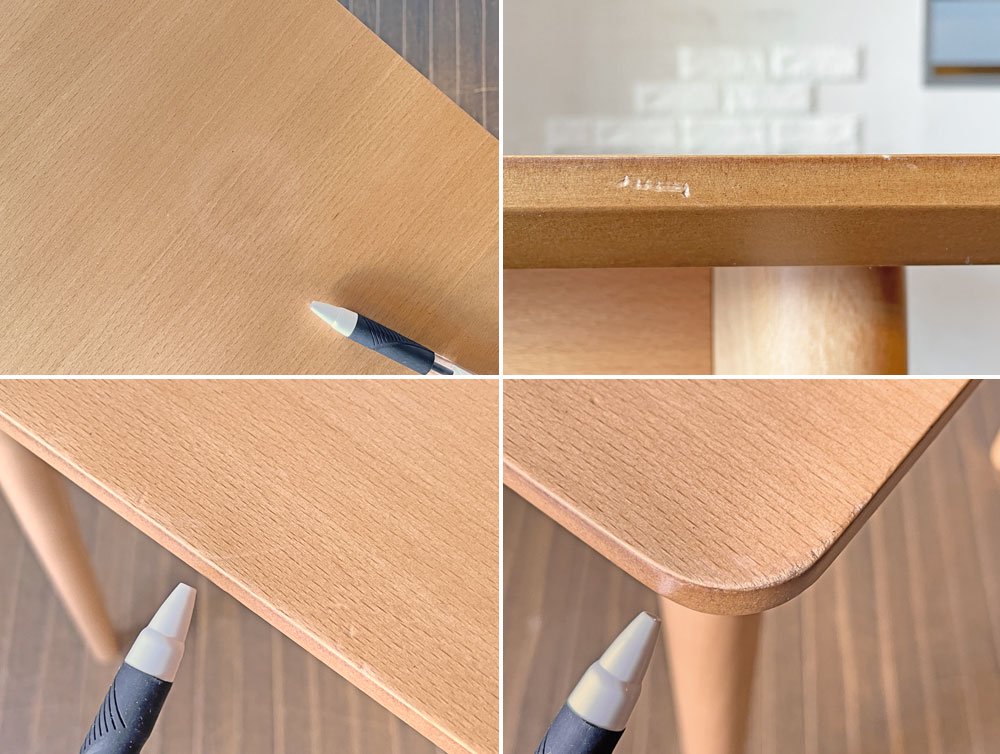使用に伴う擦れ傷の他、細かなスクラッチや打痕、天板には全体的にうっすらとした色ムラや輪染みが散見されますがいずれも大きく美観を損なうものではございません。グラつきといったご使用に問題となるダメージの見られない、USED品として概ね良好なコンディションを保っております。