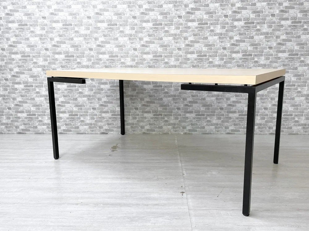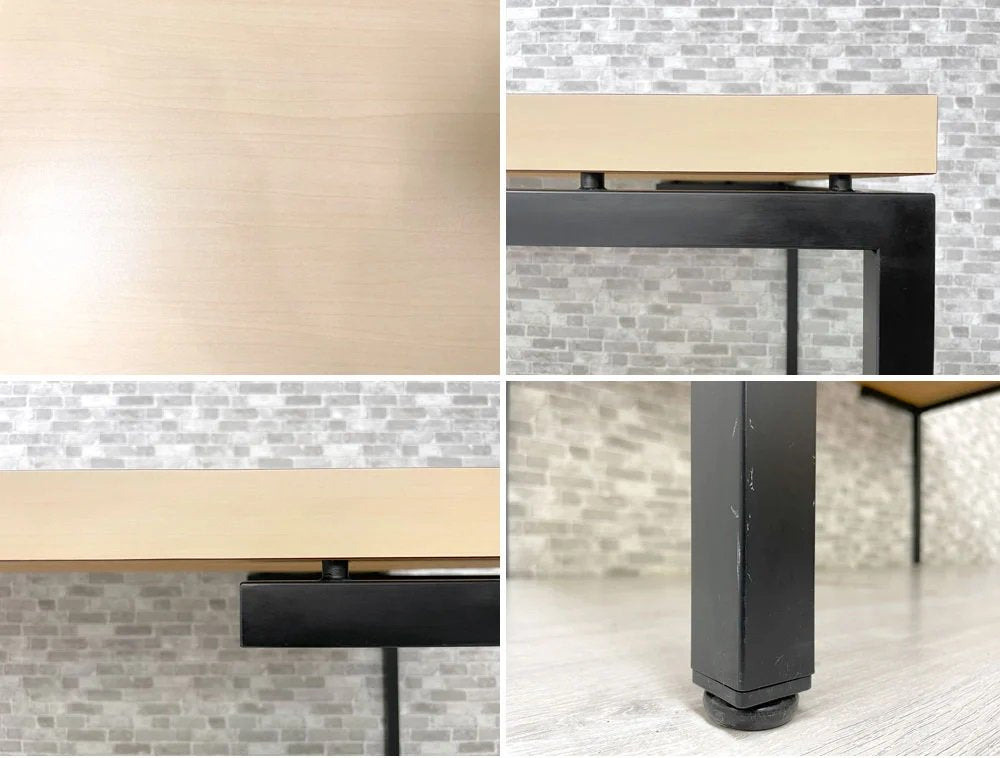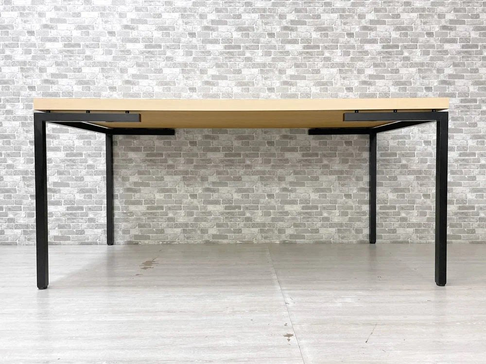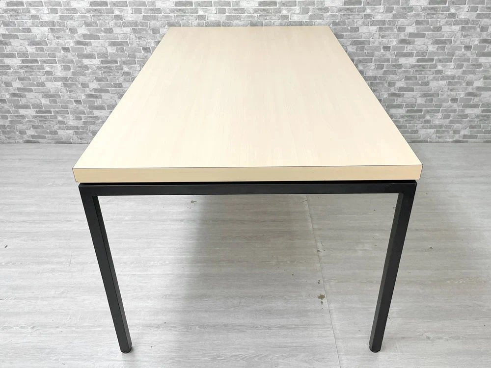こちらは余計な装飾を無くし、直線を基調にしたシンプルなフォルムで完成させたミーティングテーブル。ナチュラル色の化粧板天板とブラック色のスチールレッグで仕上げたメリハリのあるデザインは、周りの木製家具やフローリングと溶け込みながら、ホームユースは勿論、オフィス等の無機質な空間にも調和するバランスの取れた造りとなっています。