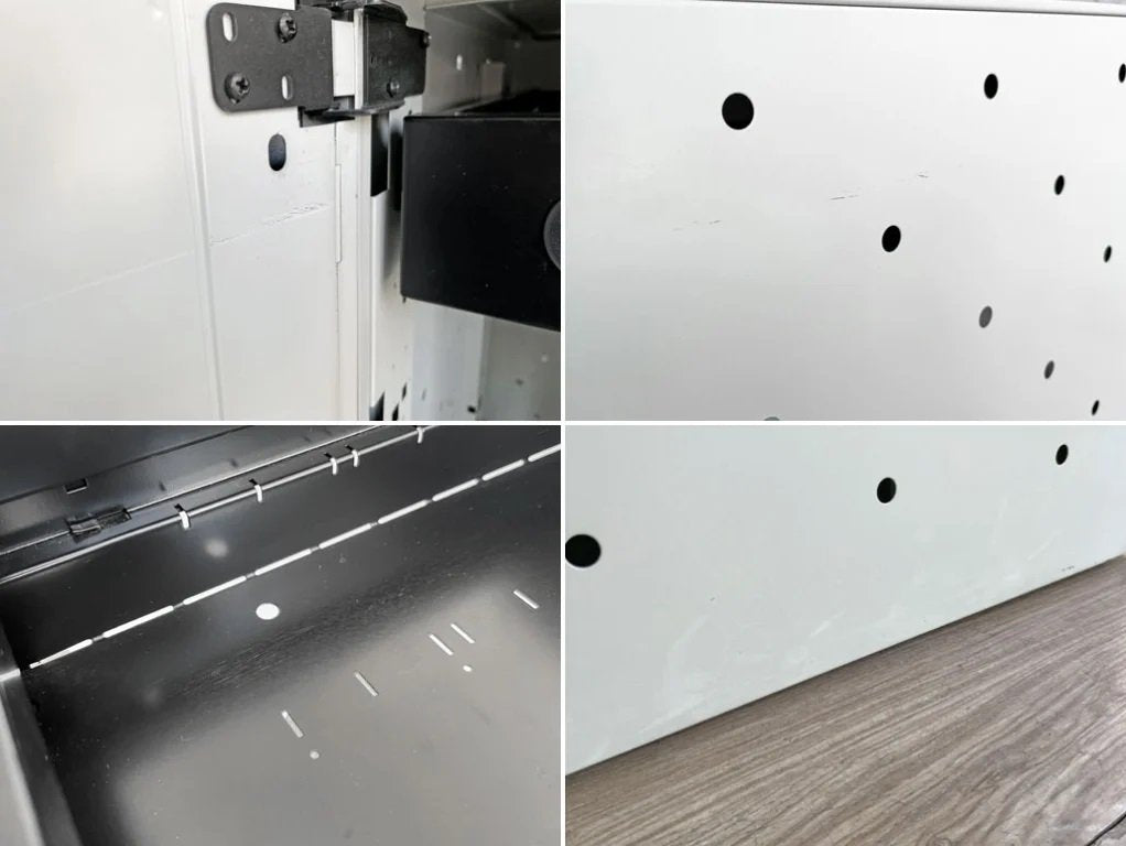 扉を開くと下部にPCサーバーを設置でき、上部には抽斗が1杯付属しています。書類や筆記用具等を仕舞うことが可能なので、デスク上の限られたスペースを有効活用できます。
