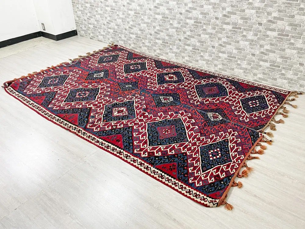 トルコ産 ワンキリム 268×178cm ウール ダイヤ エンジ系 フリンジ付き 大判 トライバルラグ ●